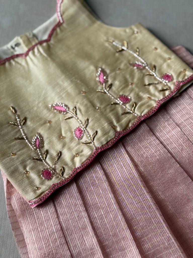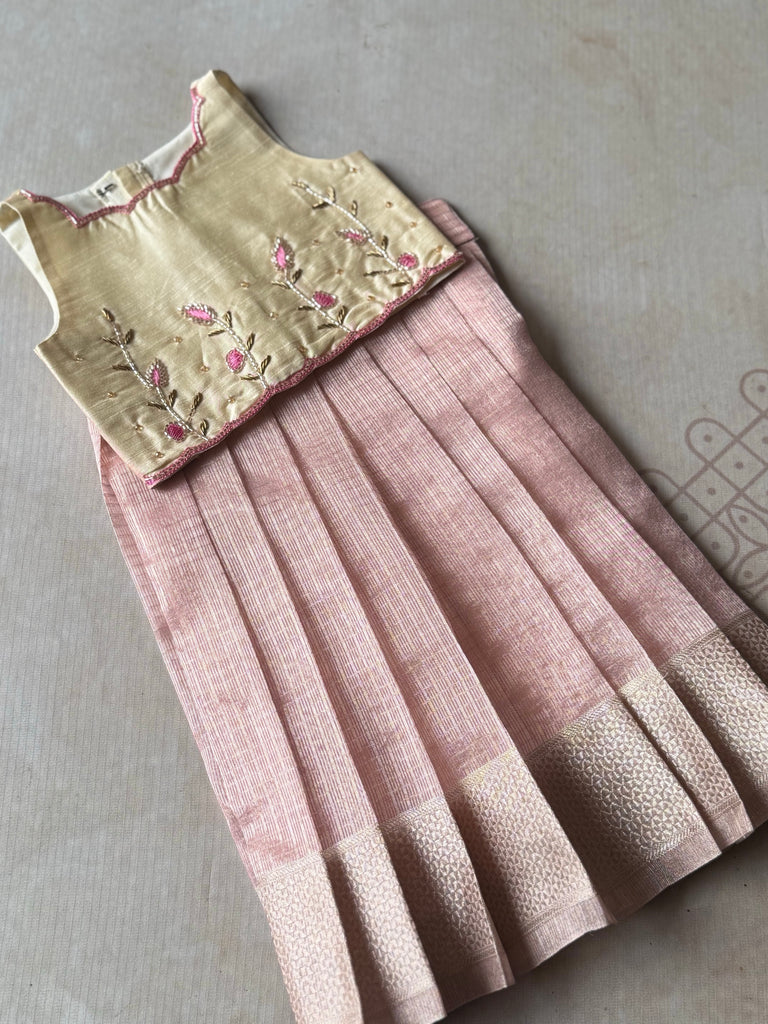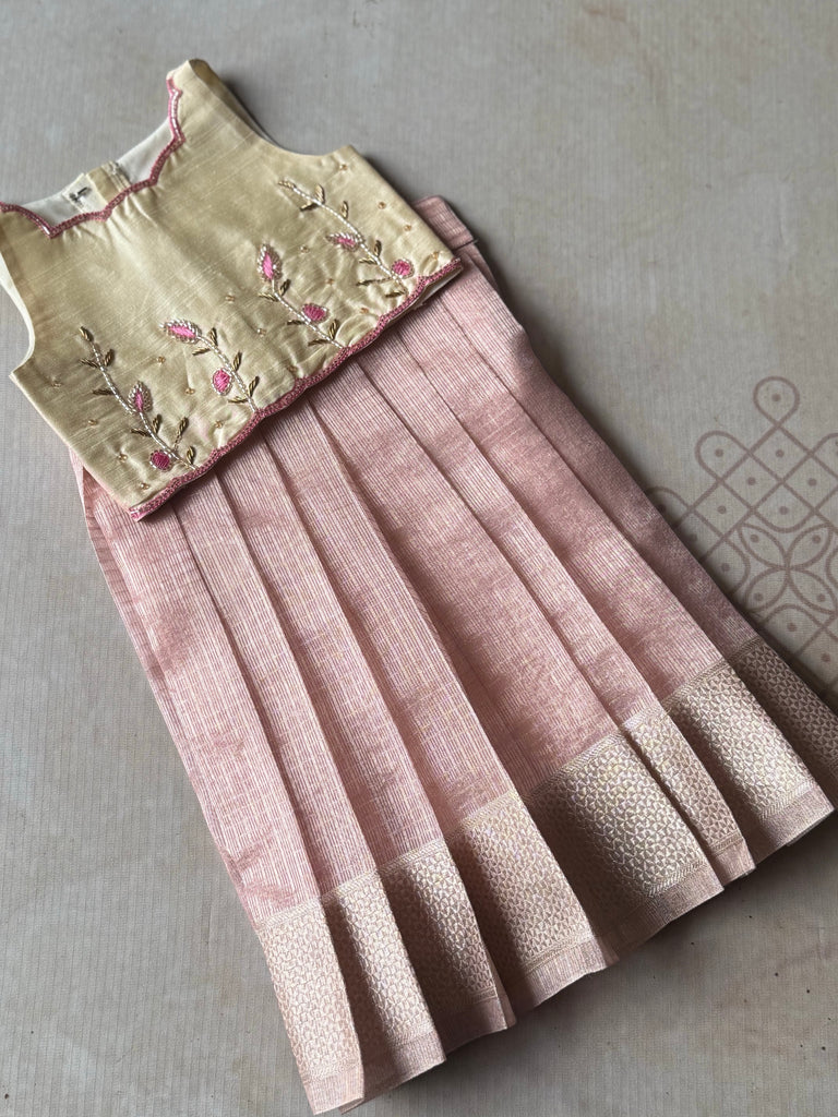 Dress your little one in elegance and tradition with this stunning ethnic ensemble. The set features a graceful baby pink kora linen skirt with delicate pleats and a beautifully woven zari border for a rich festive finish. Paired with a striking beige sleeveless crop top, embellished with hand embroidery, this outfit blends comfort with festive charm.