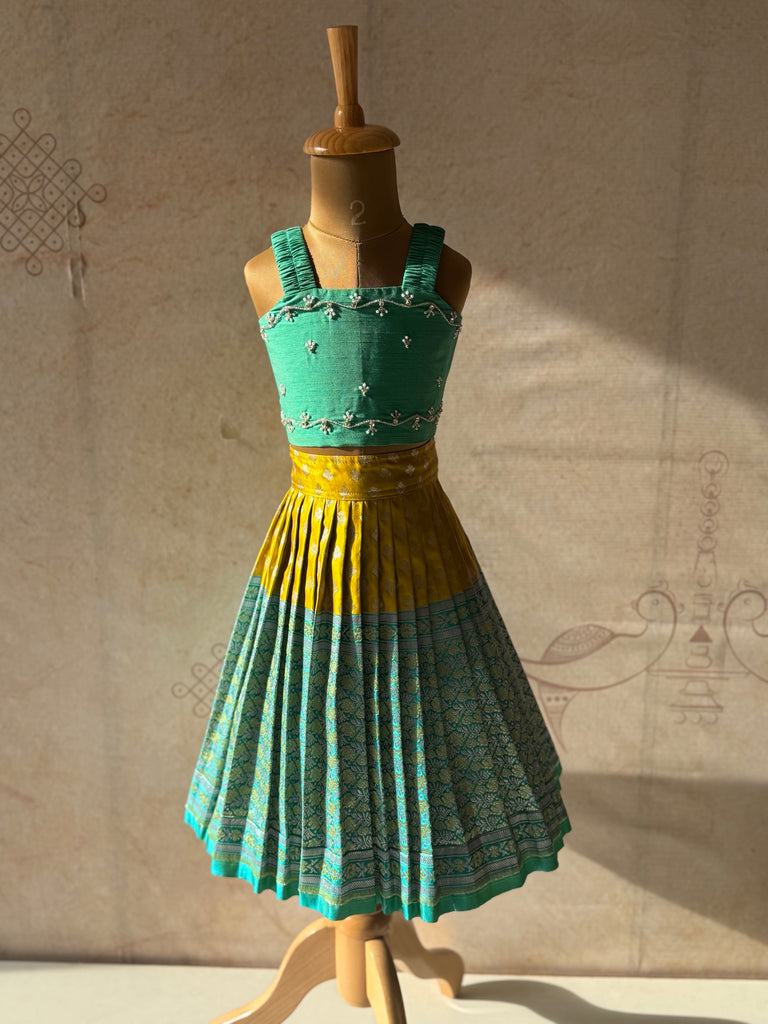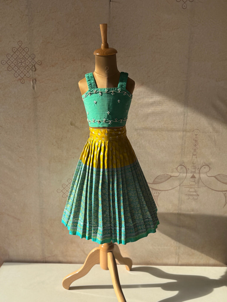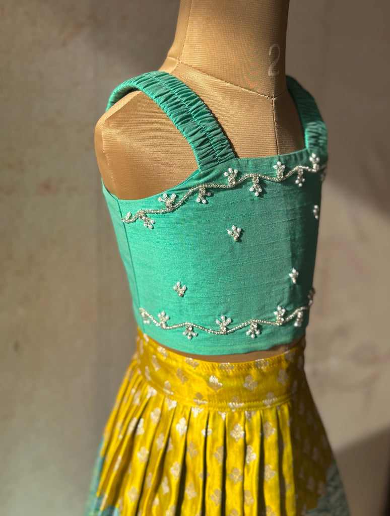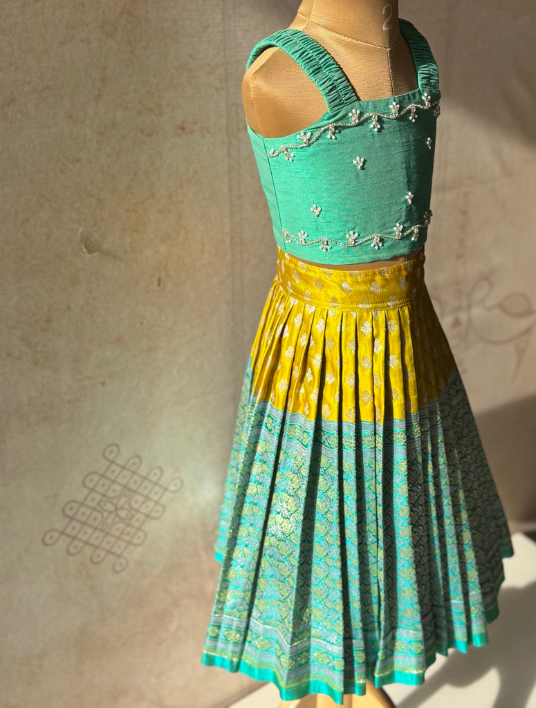 Tradition meets trend in this statement-making crop top and skirt set, designed for your little style star. The sleeveless crop top is made from luxe raw silk and finished with delicate Aari hand embroidery — a subtle nod to timeless Indian craft.