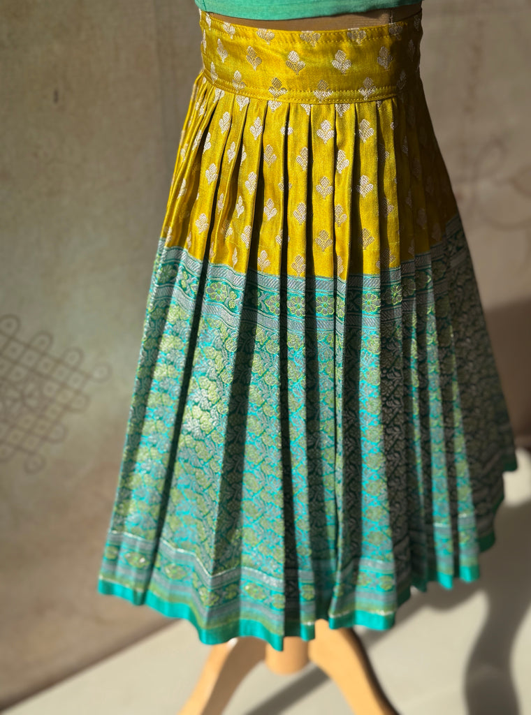 A vibrant toned Banarasi silk skirt, woven with intricate buttas and a bold border that adds flair to every twirl. Lightweight, comfortable, and celebration-ready, this outfit is perfect for festive occasions, weddings, or whenever your little one wants to shine a little brighter.