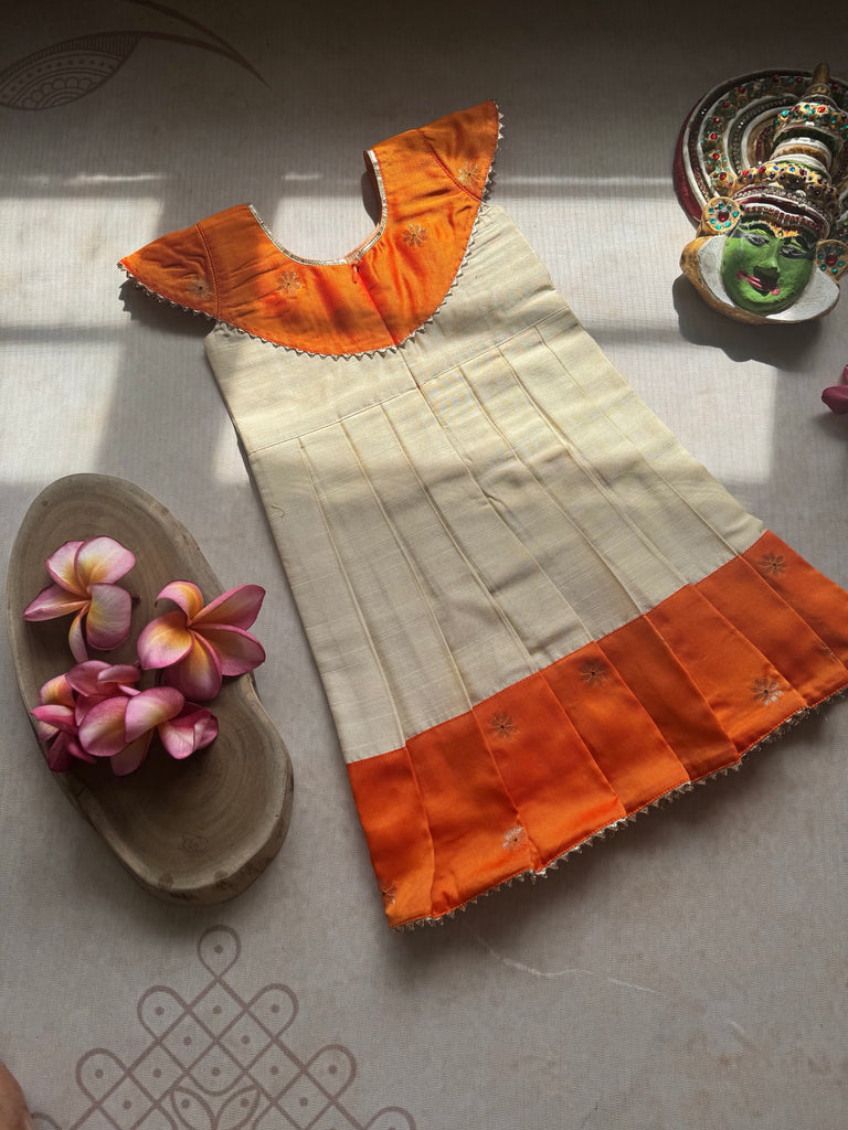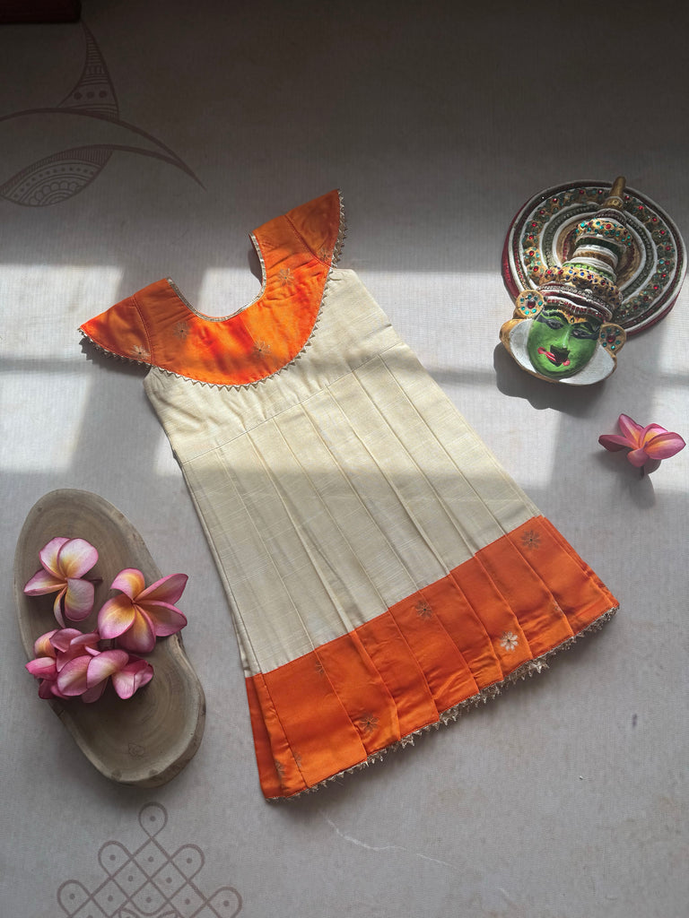 Introducing the Naya Frock - a stunning off-white frock with a beautiful Orange border and charming yoke pattern. With cap sleeves, this elegant design is perfect for any occasion. Stand out with the unique Naya Frock.