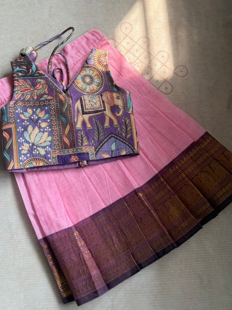 The statement deep-back design is finished with hand-tied doris, delicate beaded tassels, and a printed Banarasi hem border, adding graceful movement and artisanal charm. Paired with a lightweight Kanchi cotton skirt, the ensemble is elevated by soft pleats, a temple-style woven border, and a comfortable festive-ready waistband.