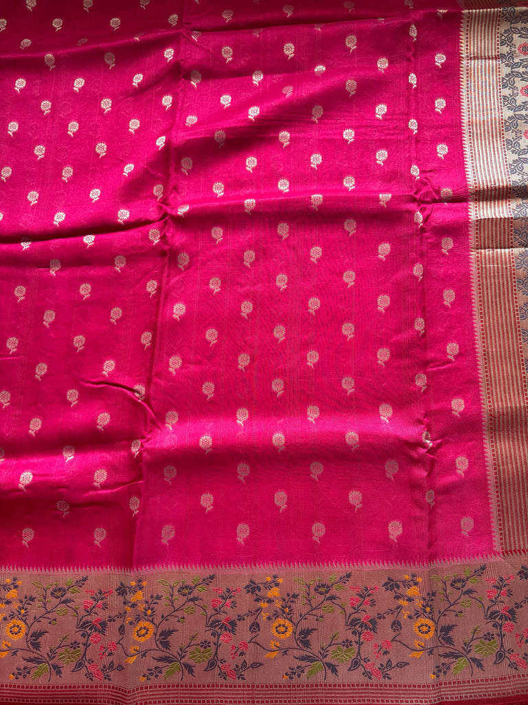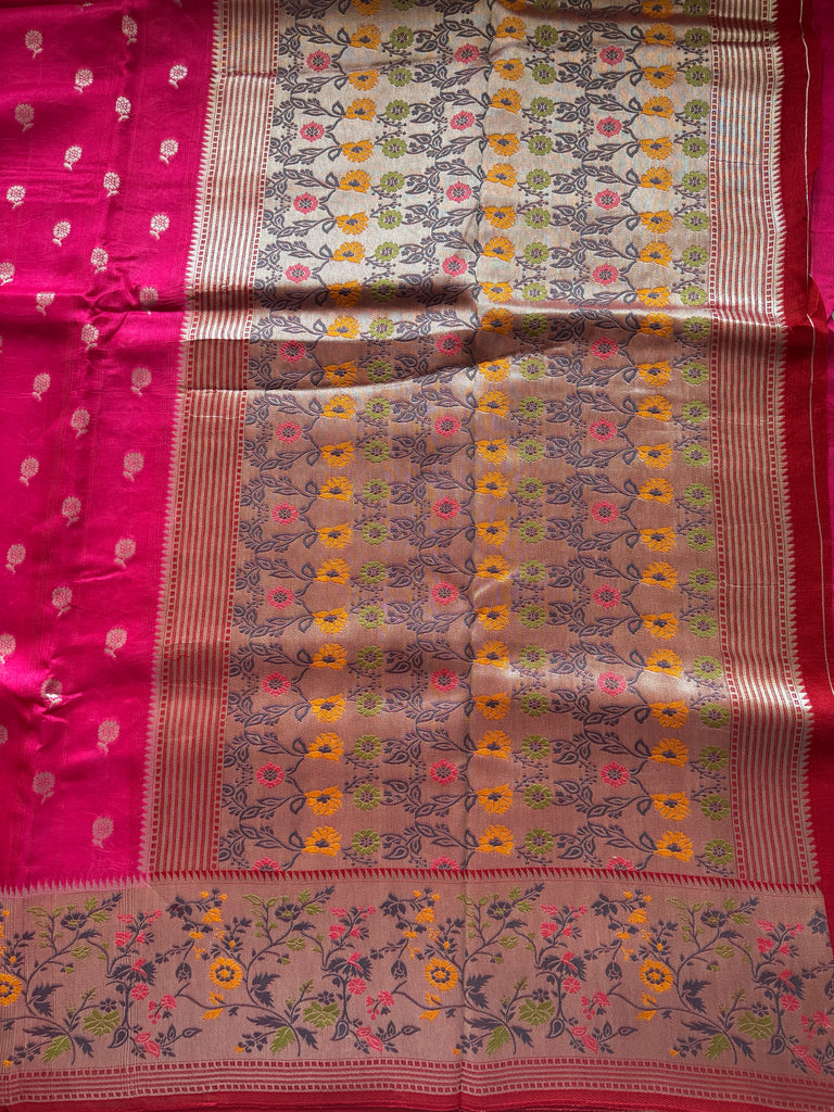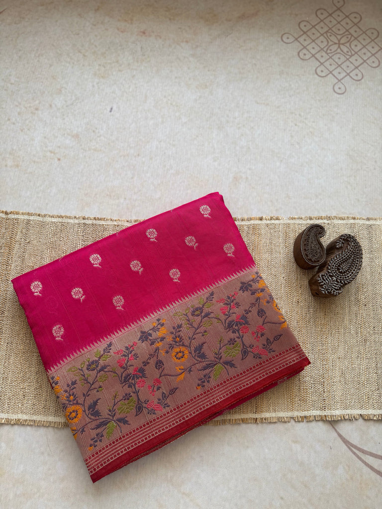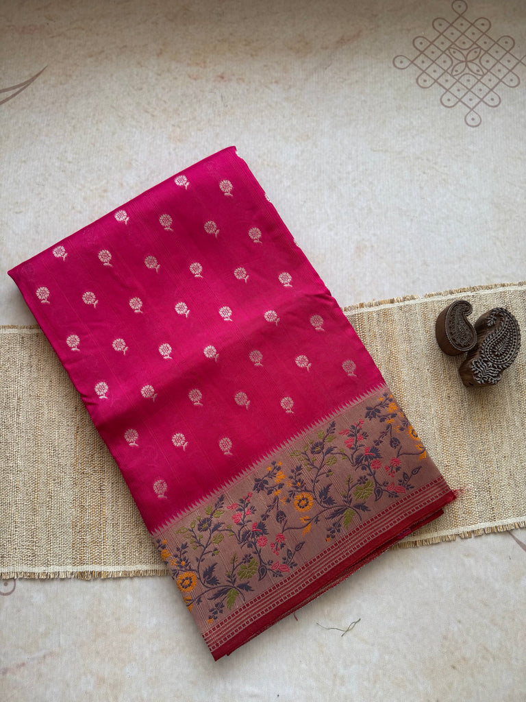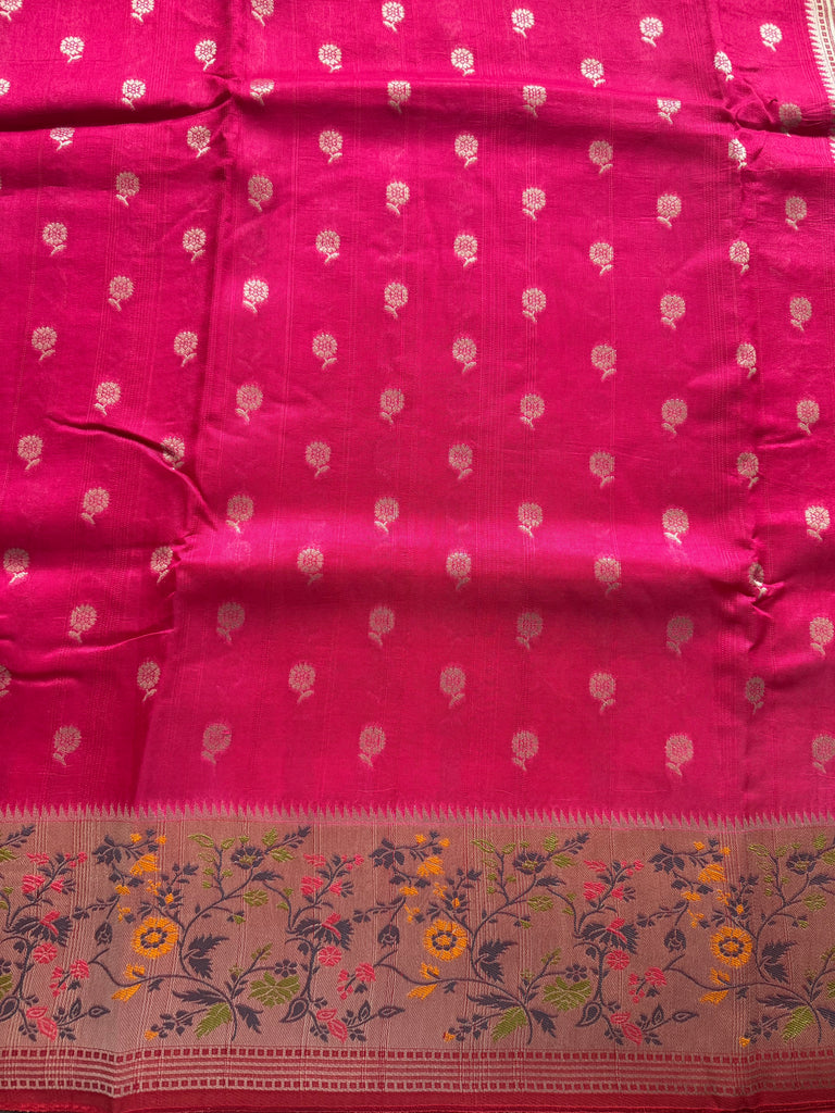 Drape yourself in elegance with this exquisite fuchsia pink Matka Tussar Banarasi saree, adorned with delicate flower buttas scattered across the fabric. The rich texture of the Tussar silk beautifully complements the vibrant fuchsia pink color, while the red border and pallu are intricately designed with Meenakari patterns and zari work, adding an opulent touch to the overall look.