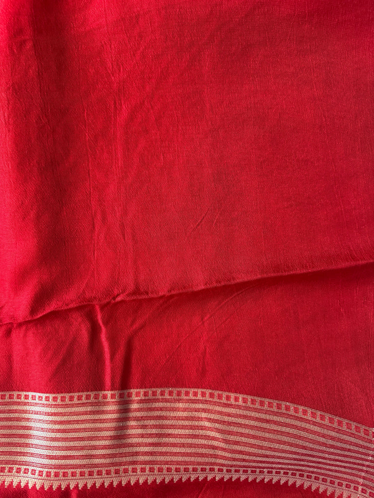 The saree is paired with a plain red blouse, featuring silver zari designs along the sleeve borders, perfectly matching the saree's detailed border and pallu. This thoughtful combination of colors and craftsmanship creates a stunning, cohesive ensemble for any special occasion.