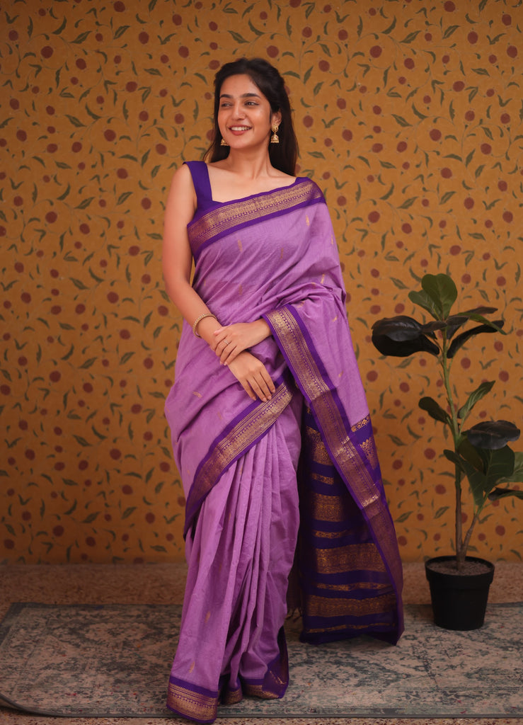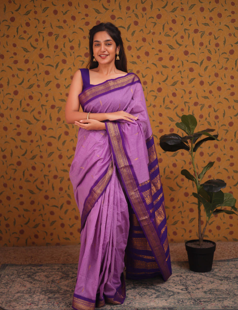 Introducing Aakriti - a luxurious semi-silk cotton saree that exudes elegance and sophistication. The vibrant lavender with blue blend is beautifully complemented by a gold zari detailed border and pallu. With the coordinating blouse fabric included, you'll have a complete and timeless look for any occasion.Buttas and border is not constraint.