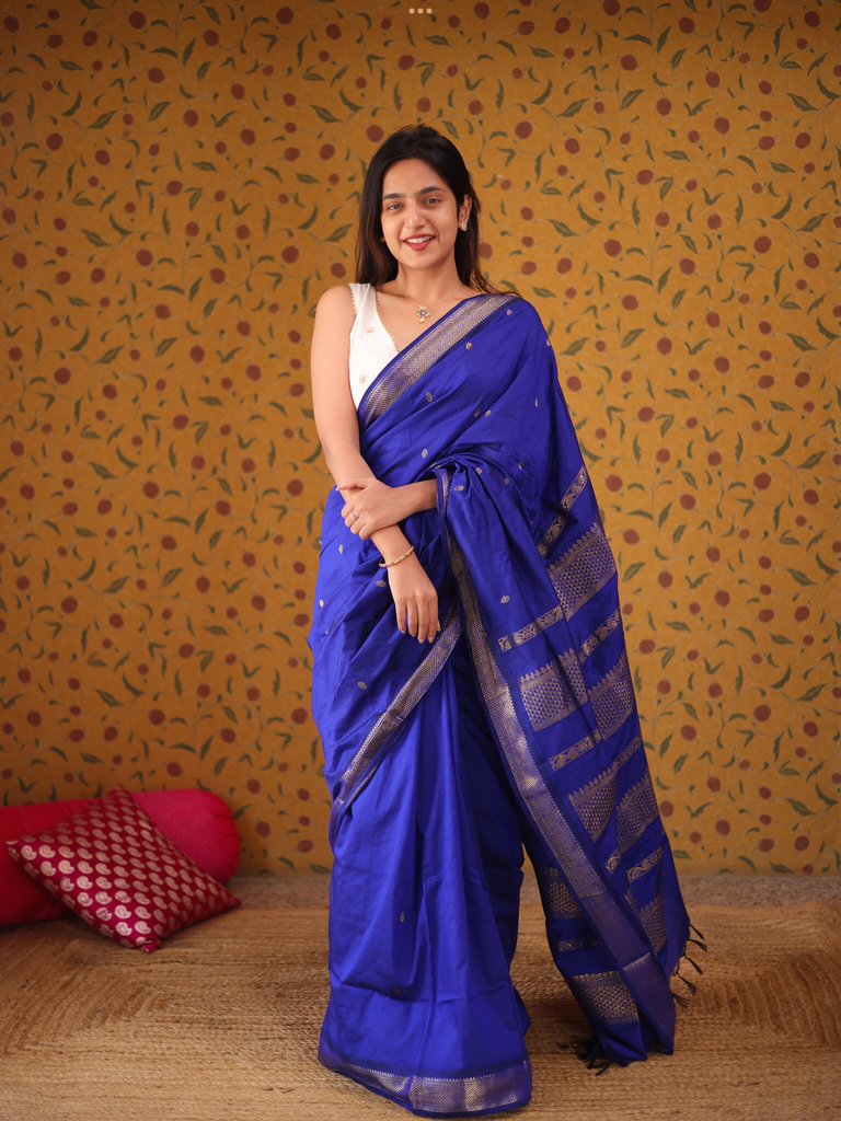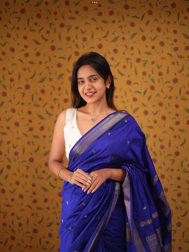 Introducing Aakriti - a luxurious semi-silk cotton saree that exudes elegance and sophistication. The vibrant purple blend is beautifully complemented by a gold zari detailed border and pallu. With the coordinating blouse fabric included, you'll have a complete and timeless look for any occasion.