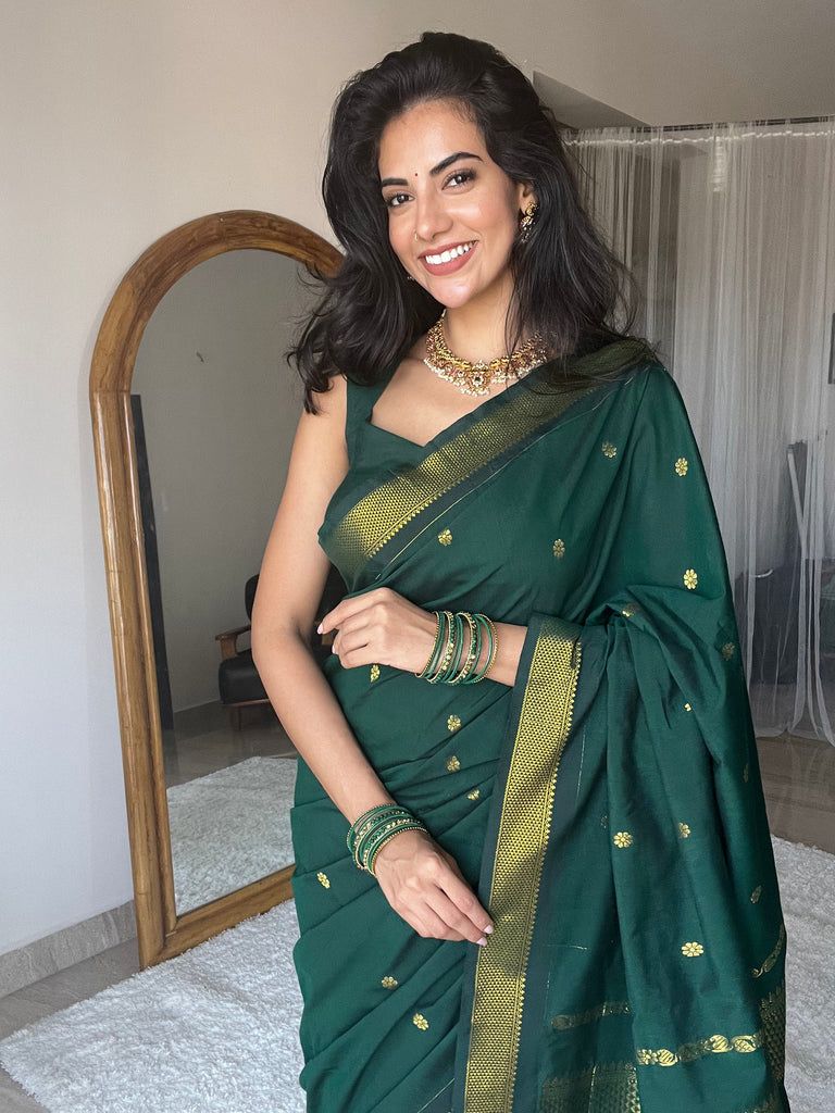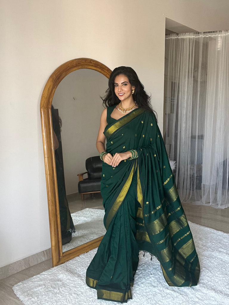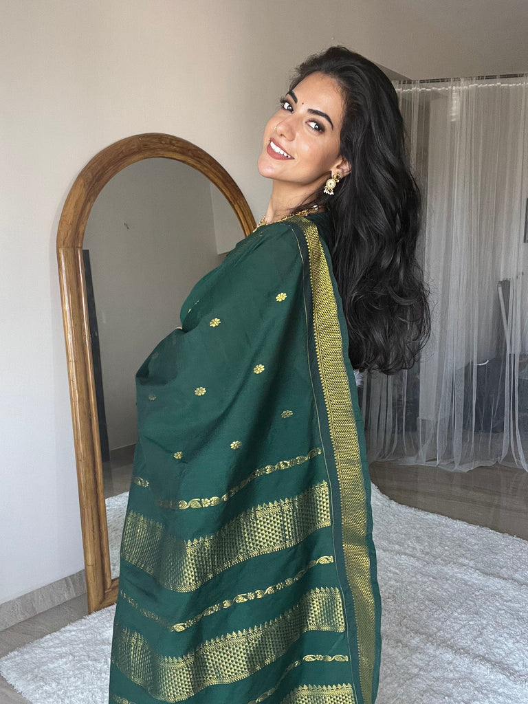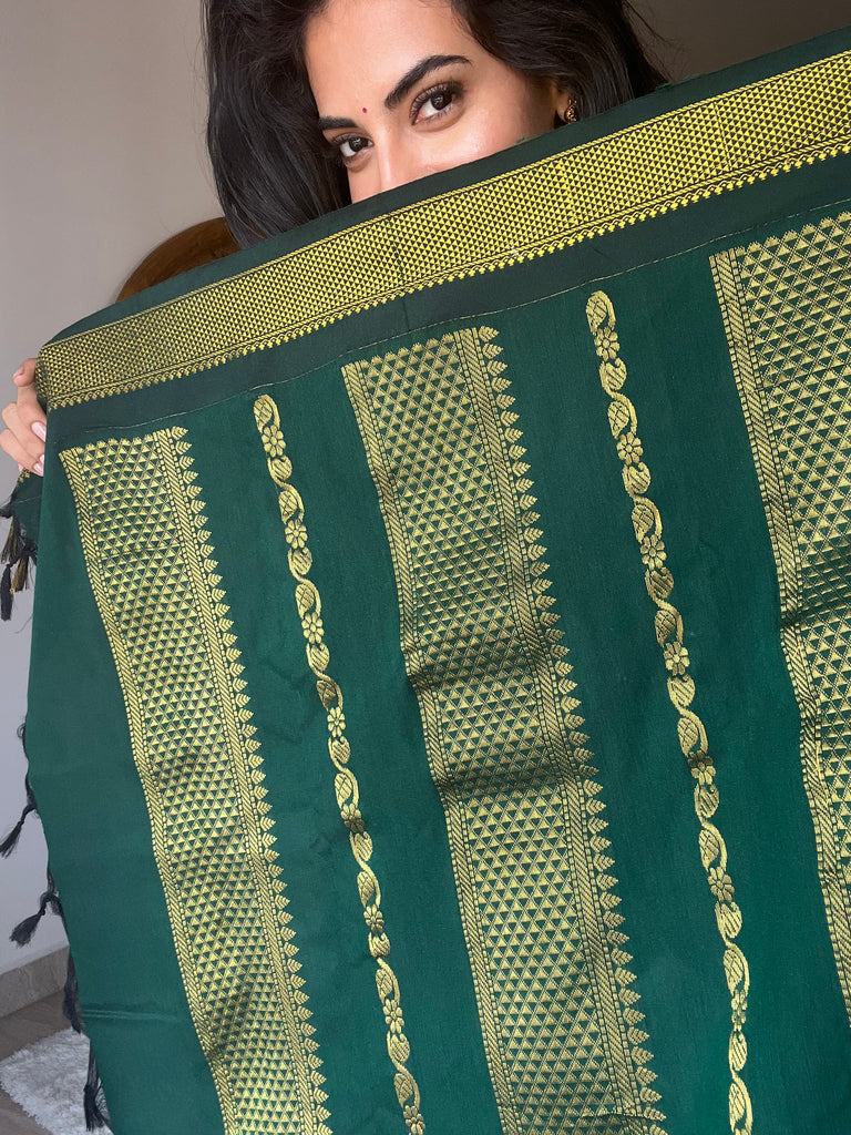 Introducing Aakriti - a luxurious semi-silk cotton saree that exudes elegance and sophistication. The vibrant green blend is beautifully complemented by a gold zari detailed border and pallu. With the coordinating blouse fabric included, you'll have a complete and timeless look for any occasion.