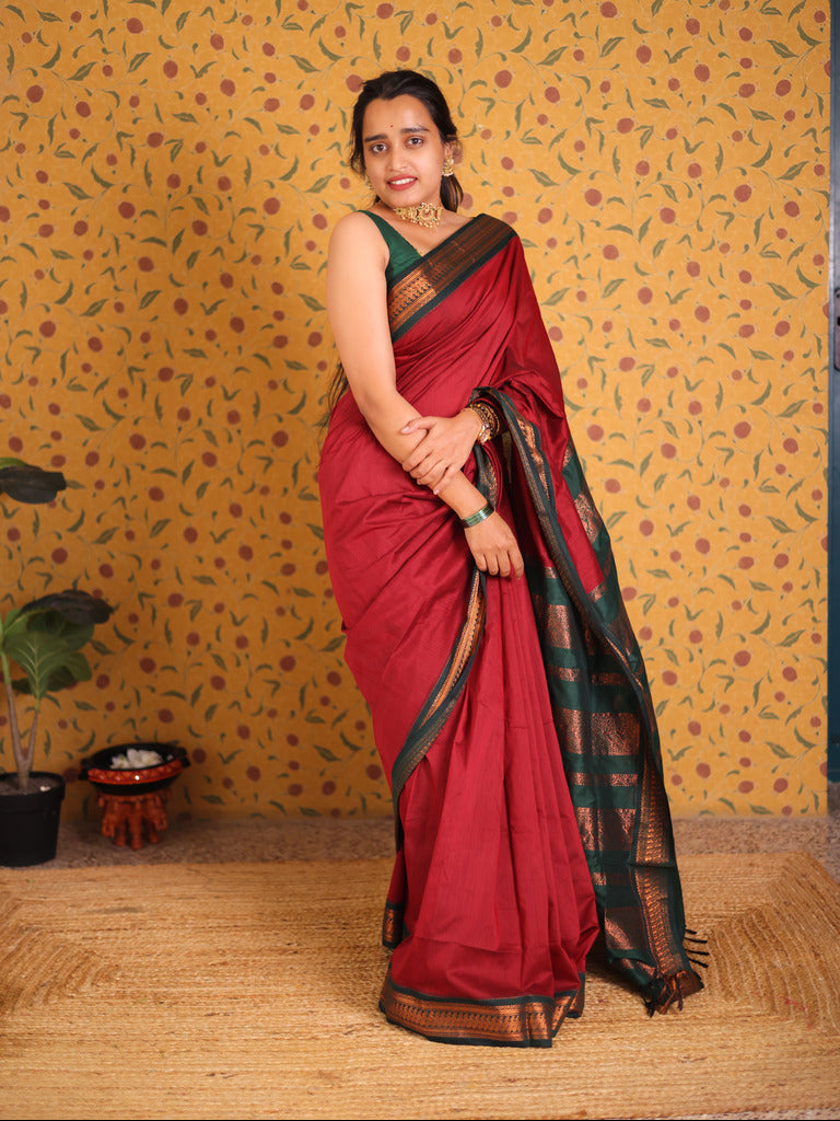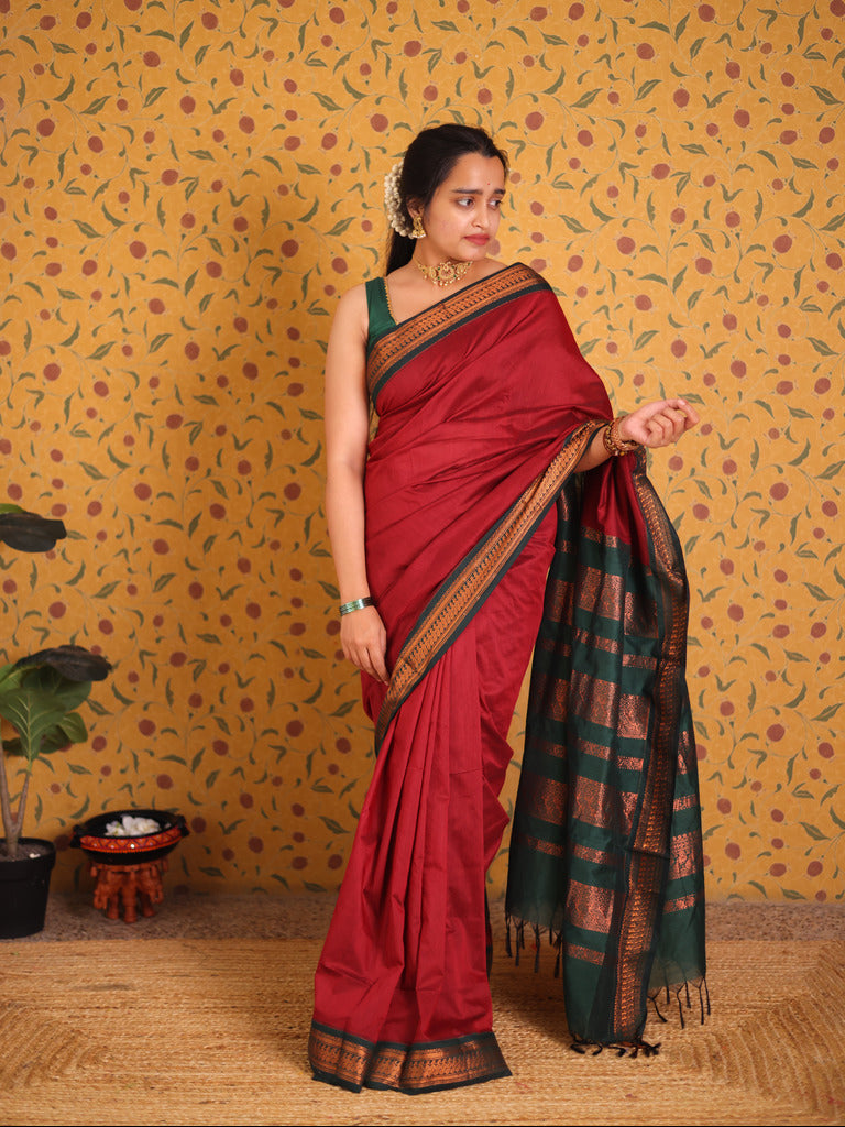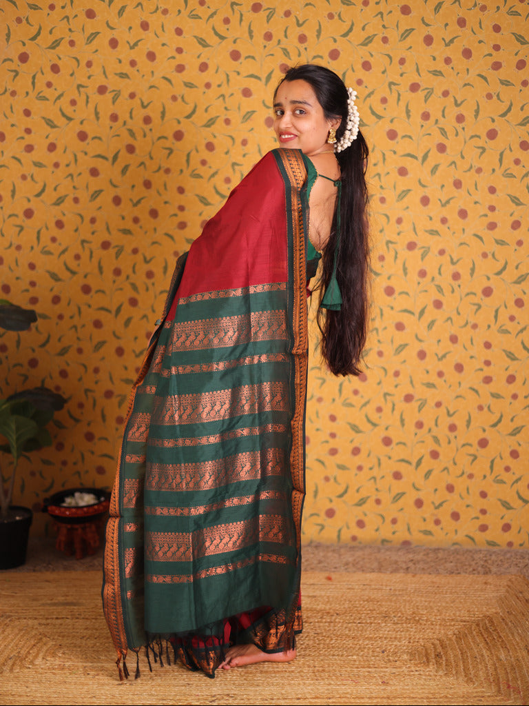 Aakriti is a statement piece crafted with intricate details. The elegant Red and Green semi-silk fabric, combined with a contrast blouse fabric detailed with intricate gold zari, make this ensemble a luxury showstopper. Perfect for special occasions, Aakriti will have you feeling confident and beautiful all night long.