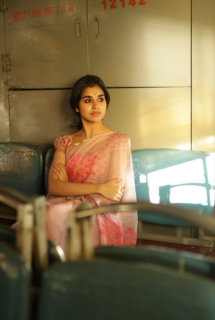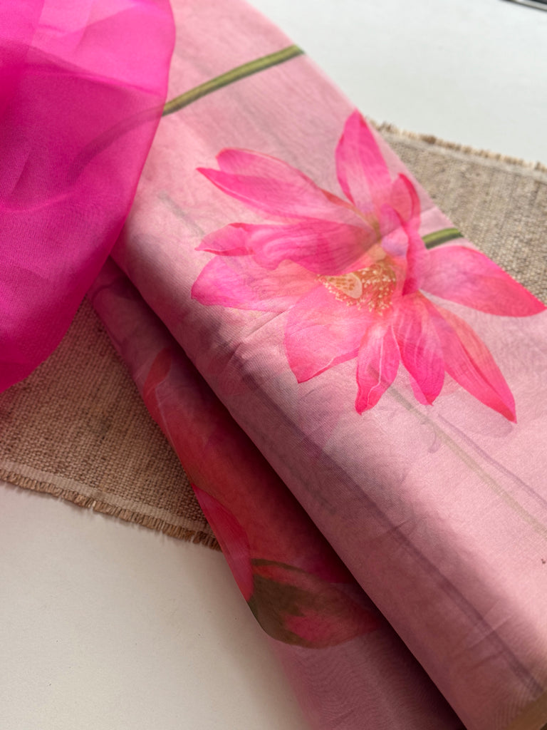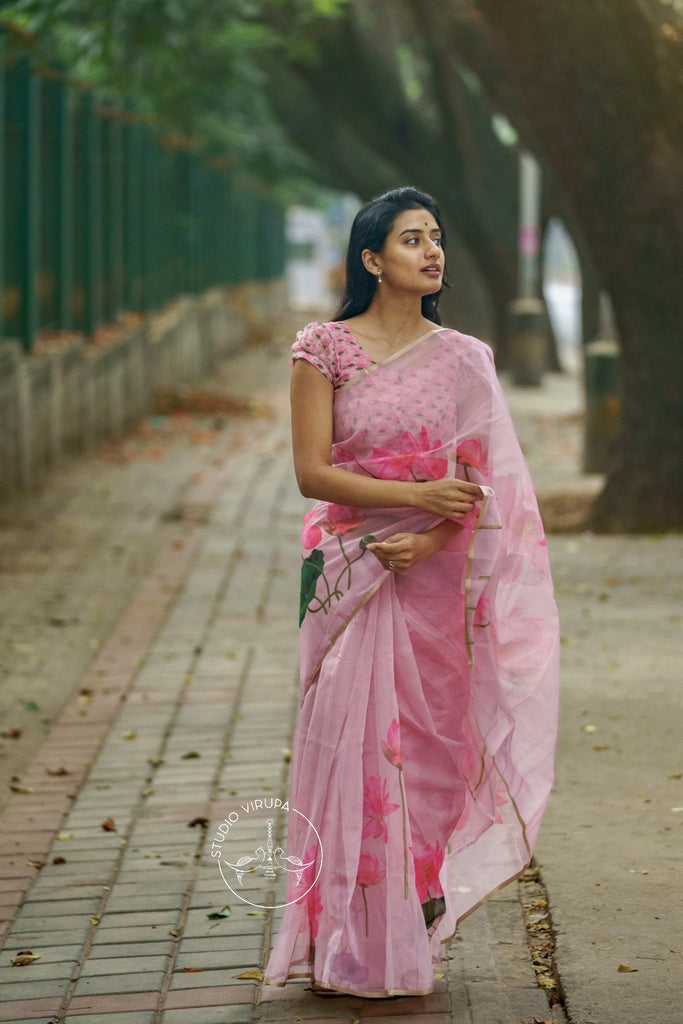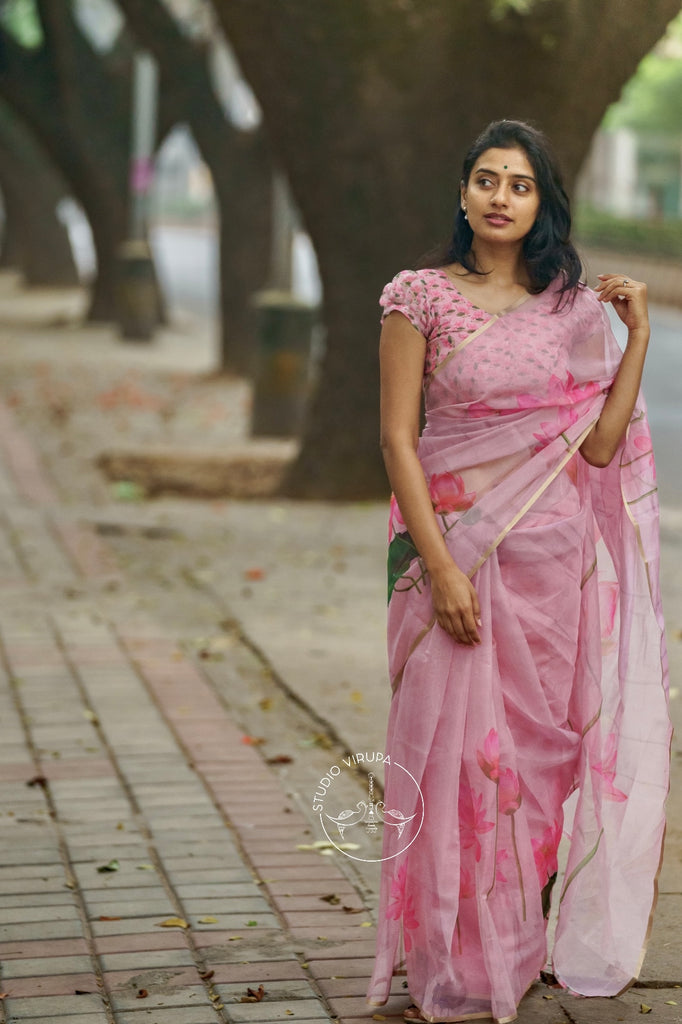 The Aila organza saree flaunts a delicate floral design on a sheer organza fabric, creating a graceful look perfect for formal occasions. Layer it with drapes for an ethereal, feminine vibe for a timeless look.