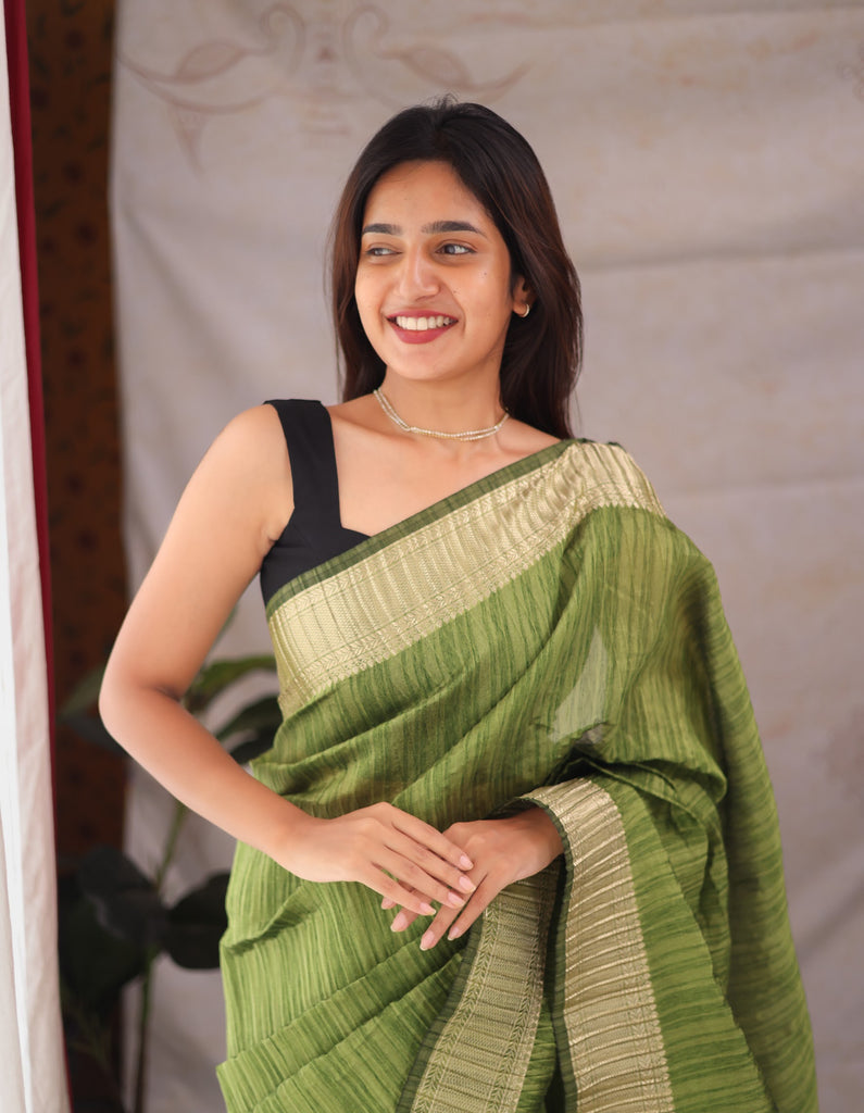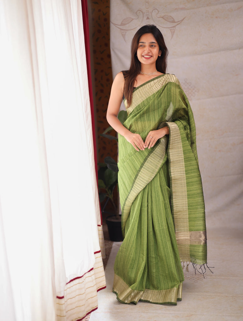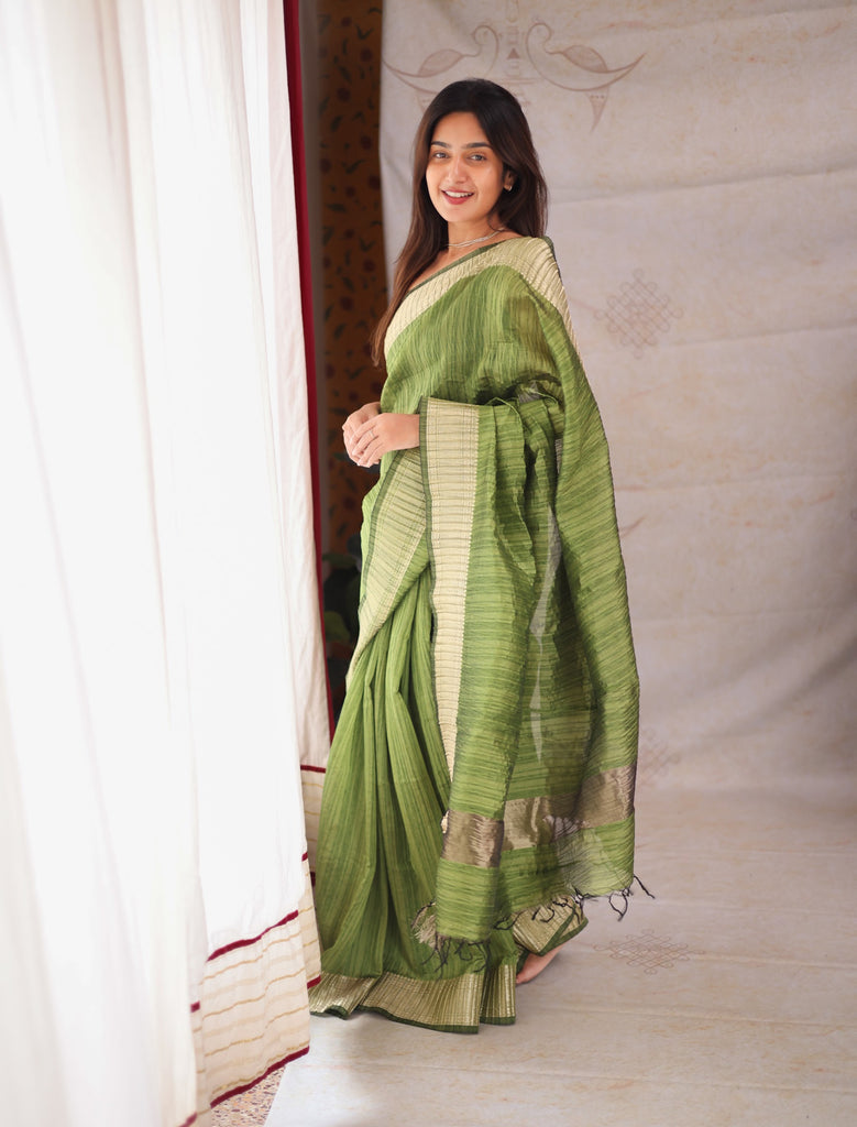 A timeless classic, this Tussar silk saree features a subtle zari border, blending understated elegance with traditional charm. The pallu carries a minimal design, echoing the simplicity of the border for a refined finish.