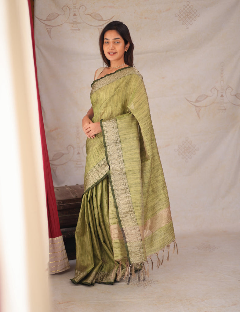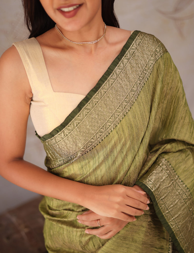 Rooted in tradition yet effortlessly modern, this Tussar crush tissue silk saree features a sleek zari border and a subtle, minimal pallu, capturing the beauty of simplicity with a refined finish.