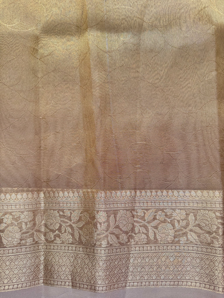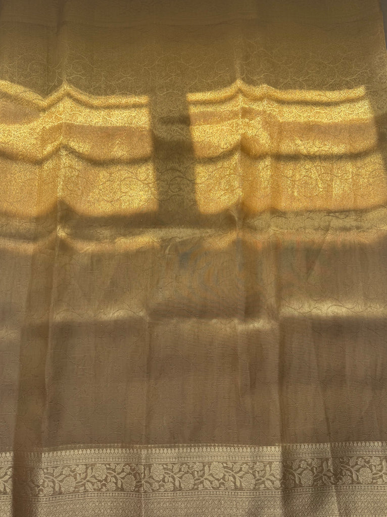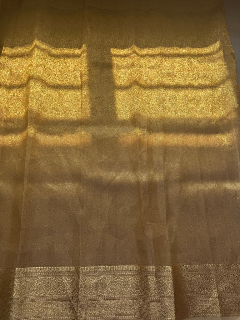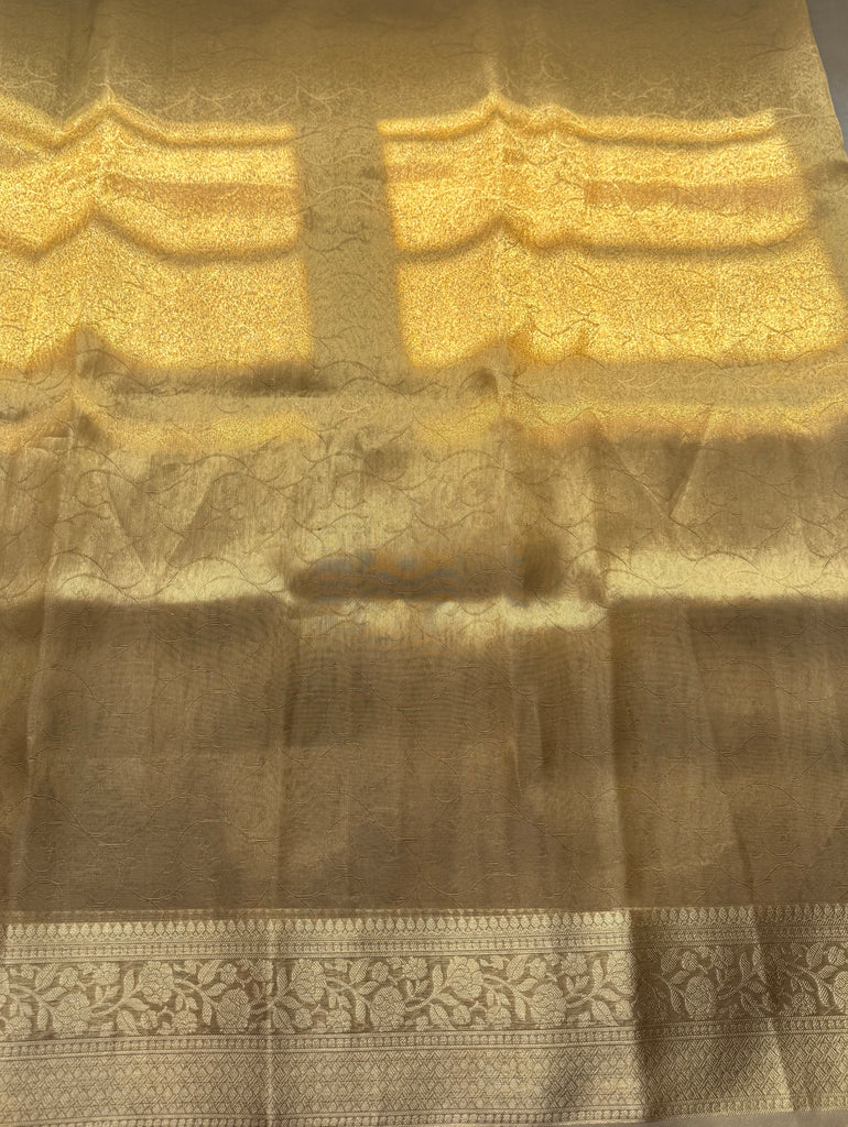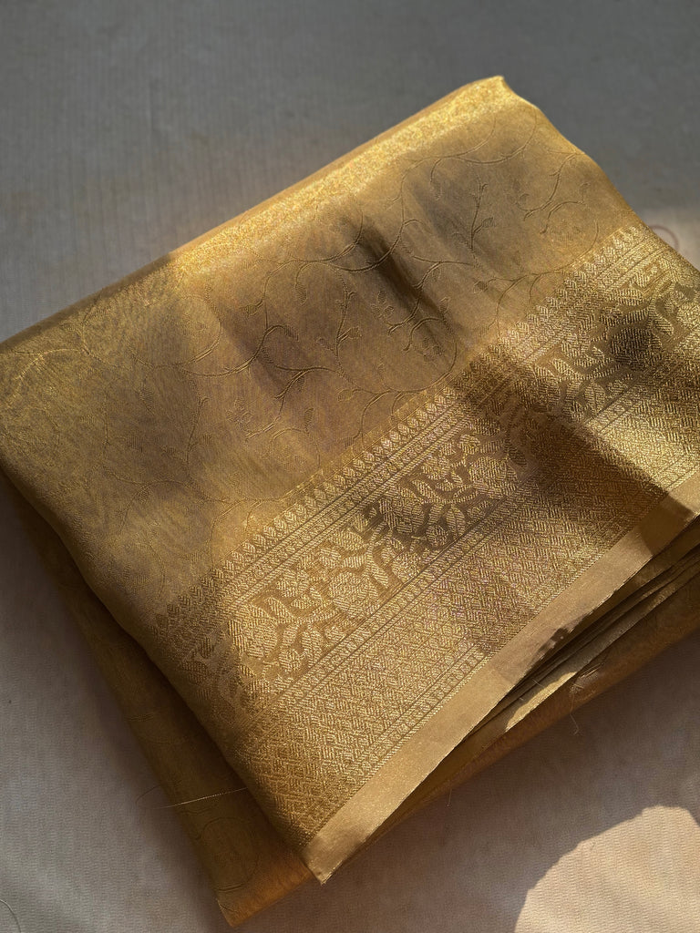 Drape yourself in timeless elegance with our Molten Gold Tissue Silk Saree, a radiant celebration of India’s rich textile heritage. The saree features an exquisite embossed jaal pattern, with delicate floral and vine motifs handwoven in shimmering zari. Woven with intricate Banarasi zari craftsmanship, this saree shimmers in opulent jewel tones, echoing the legacy of regal attire once favored by royalty.