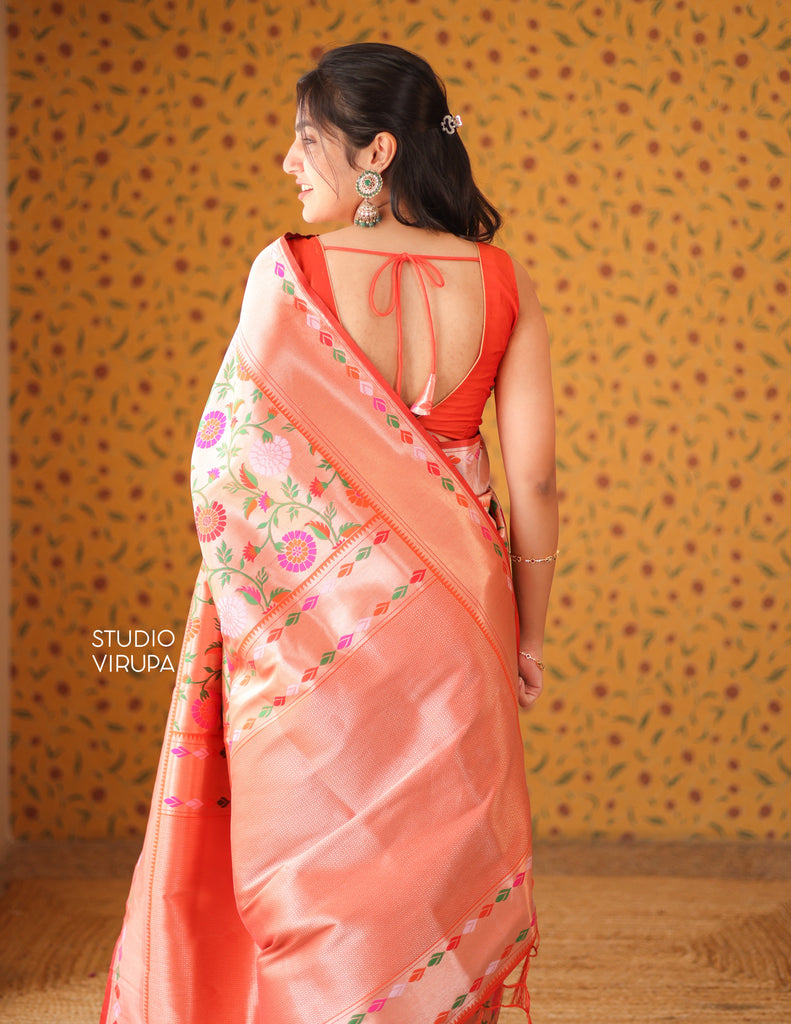 Fall in love with our Boutique collection featuring a Banarasi semi silk saree adorned with a breathtaking floral design. Experience the beauty and elegance of this woven masterpiece that will surely make you stand out. Elevate your style and grace with this stunning saree. Comes with running blouse fabric.