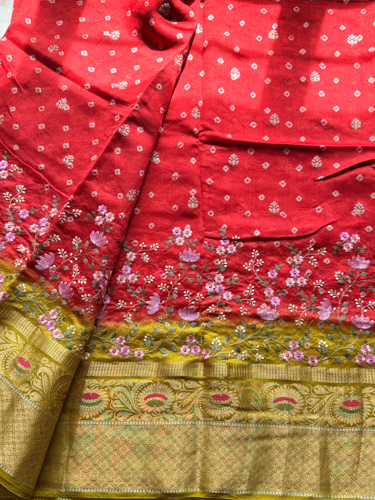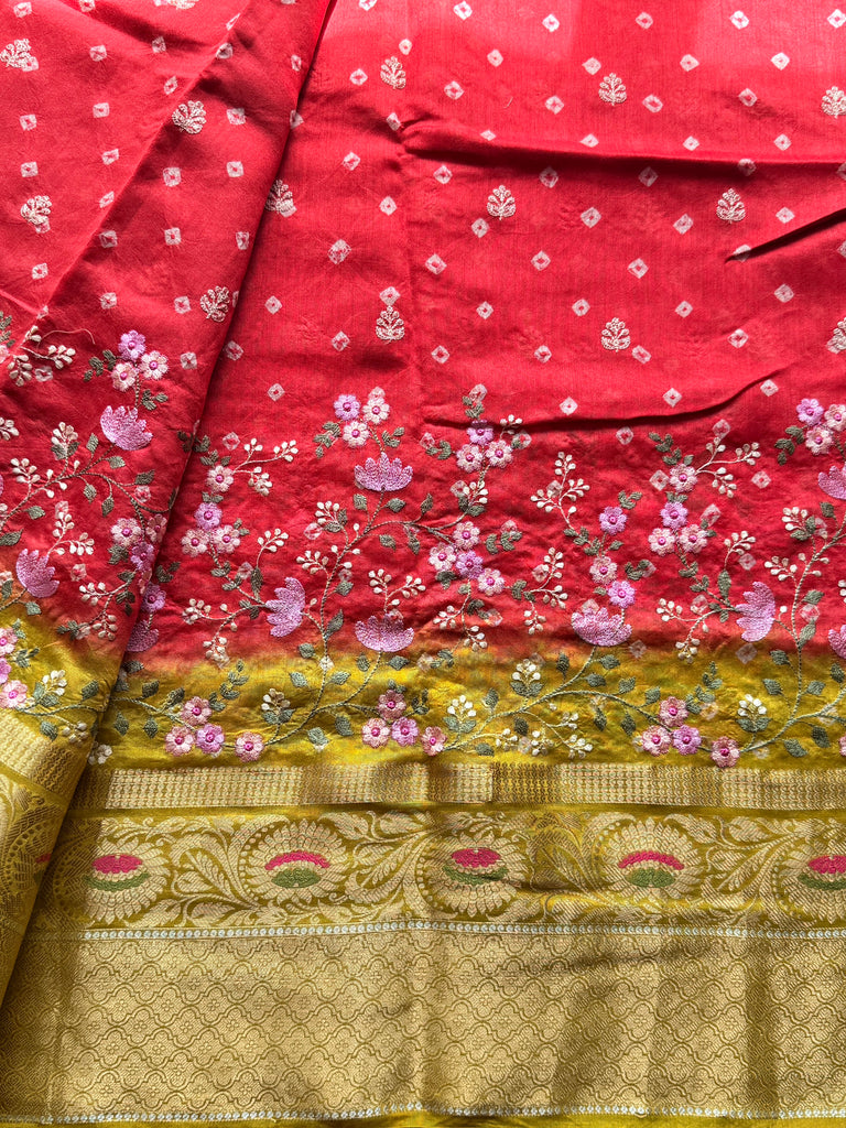 This elegant Pure Munga Silk Bandini saree in a fresh Red hue features an all-over traditional Bandini design, accented with delicate embroidered motifs on the body. Just above the border, graceful floral embroidery adds a touch of feminine charm.