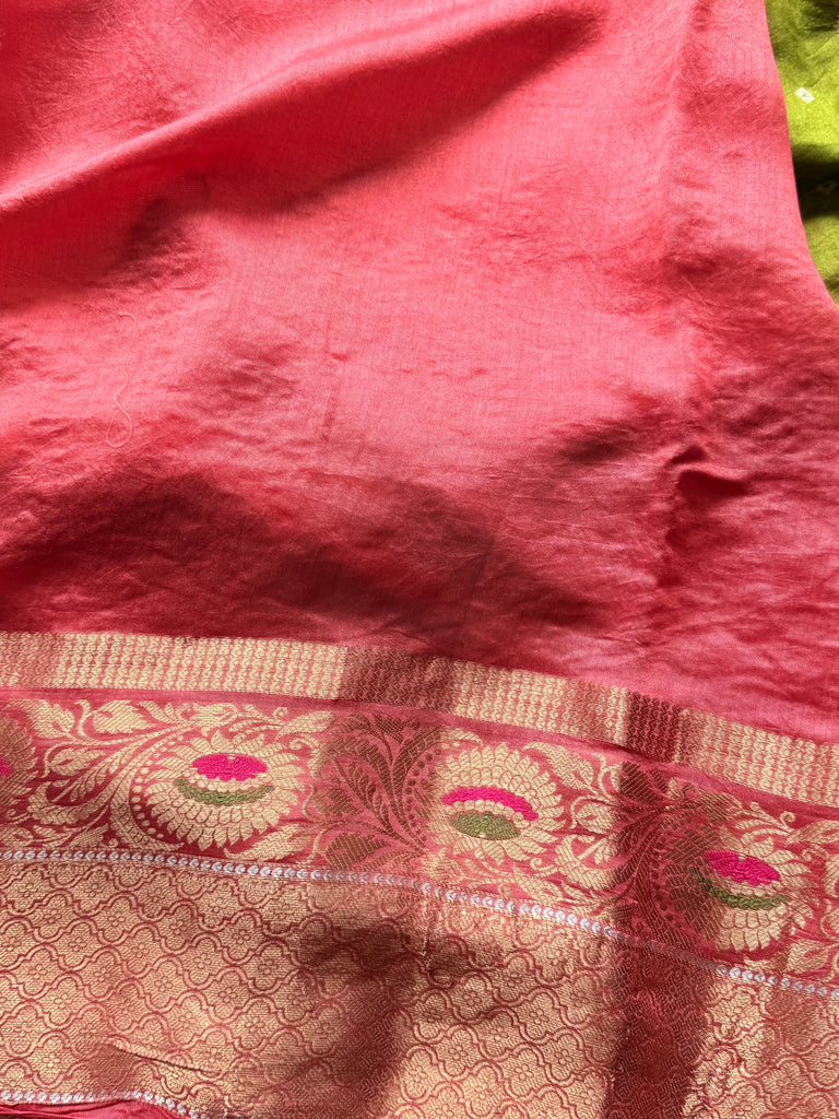 The contrasting Shade of green border is richly woven with meenakari work and intricate zari jaal patterns, bringing depth and vibrance to the look. The pallu is adorned with fine zari detailing, while the blouse remains plain with zari borders—striking a perfect balance between ornate and understated elegance.