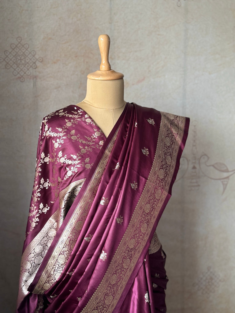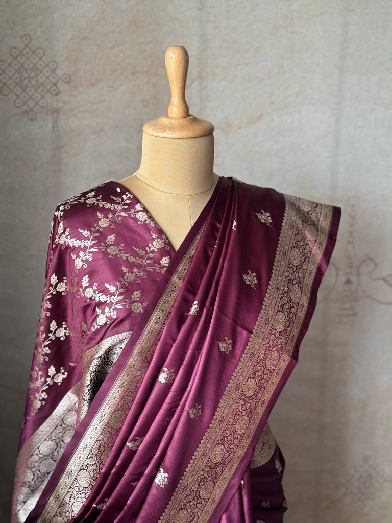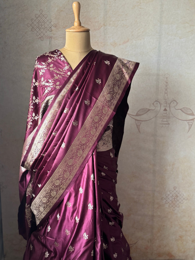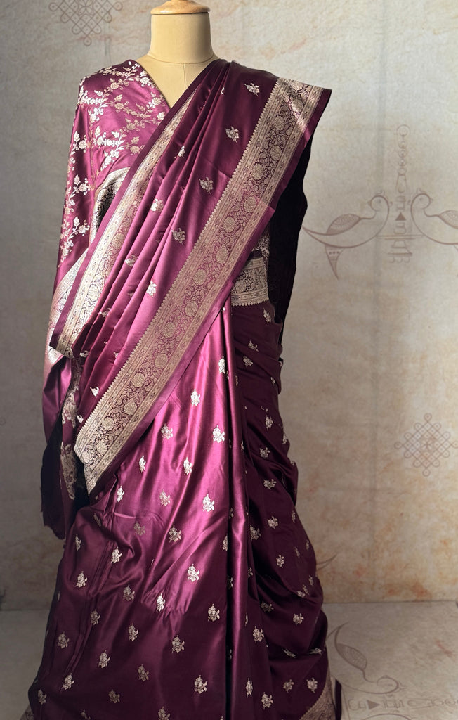 Valkalam Silk Saree in Royal Wine – This exquisite Valkalam silk saree comes in a deep royal wine shade, adorned with delicate gold zari motifs scattered gracefully across the body. The saree features a beautifully woven traditional zari border and pallu, exuding timeless elegance. The matching blouse is designed in an intricate jaal pattern with rich zari work, adding a regal charm. Perfect for weddings, festive occasions, and grand celebrations, this saree captures the essence of heritage weaving with a luxurious modern appeal.