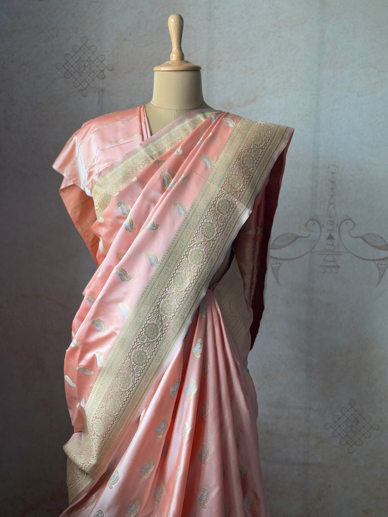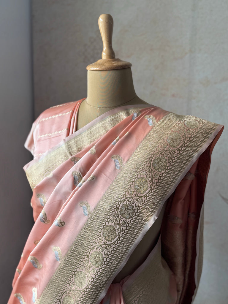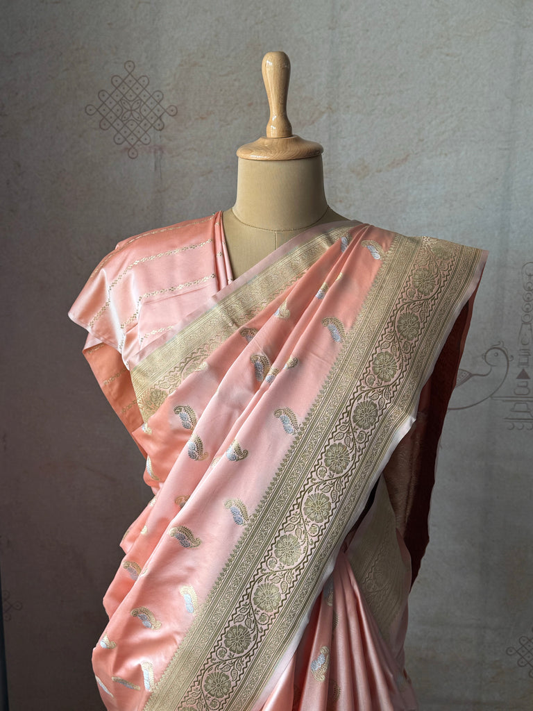 Peach Valkalam Silk Saree – A graceful peach-hued Valkalam silk saree, adorned with exquisitely woven sona rupa(gold and silver) leaf buttas across the body. The saree is framed with a stunning jaal-patterned zari border, enhancing its regal elegance. The accompanying blouse features elegant golden zari stripe work with intricate detailing, adding a refined touch. Perfect for weddings, festive occasions, and traditional gatherings, this saree beautifully blends classic artistry with sophisticated charm.
