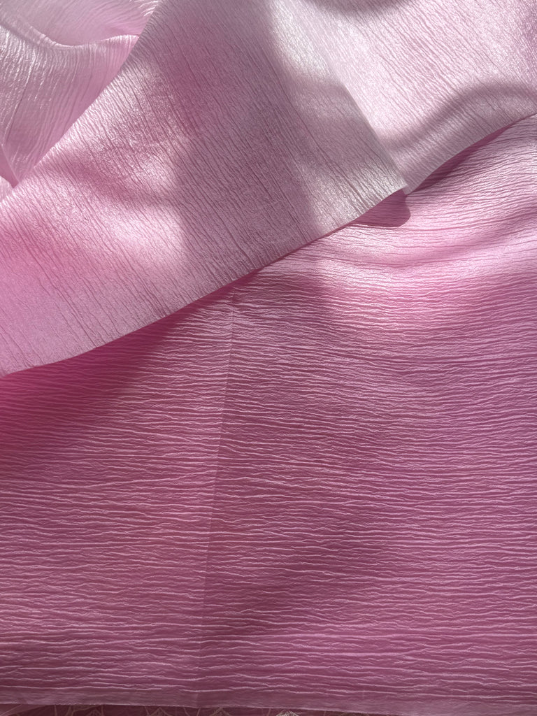 Drape yourself in elegance with this exquisite Micro-Pleated Georgette Saree, designed to make every occasion special. The saree features a stunning ombré shading in soft pink hues, creating a graceful gradient effect that enhances its charm.