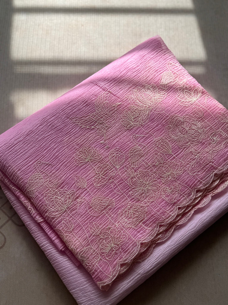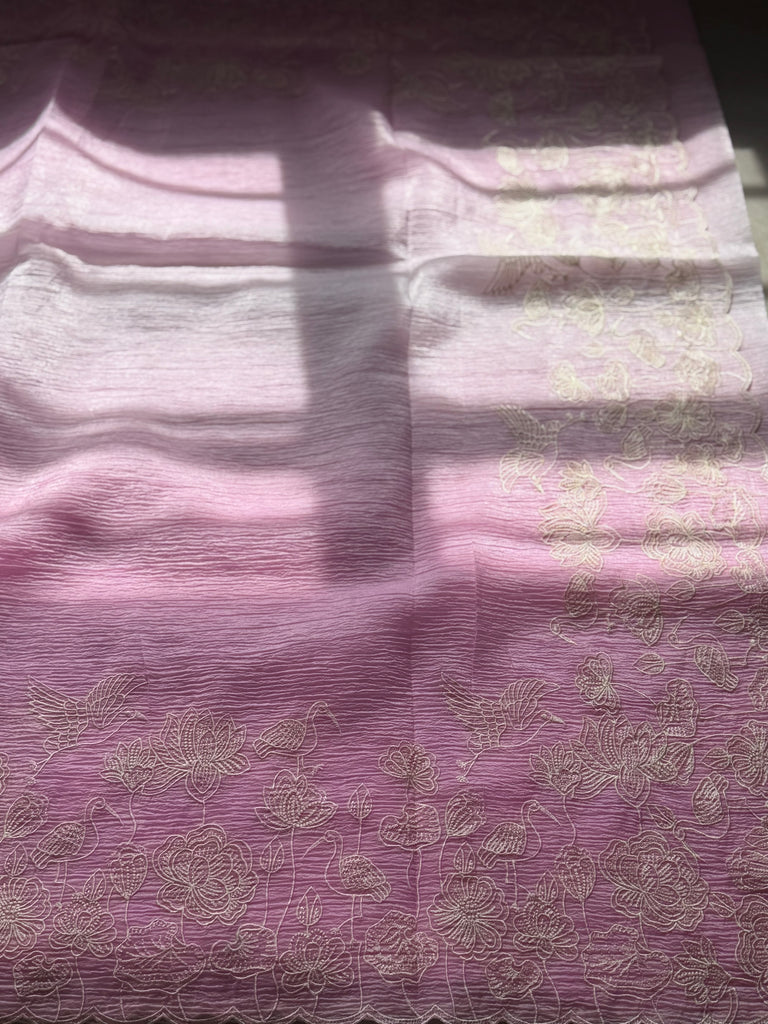 Delicate hand embroidery adorns the fabric with intricate motifs of cranes, lotus flowers, and flowing vines, adding a touch of timeless artistry. The micro-pleated texture not only gives the saree a modern flair but also ensures effortless draping with a lightweight, graceful fall.