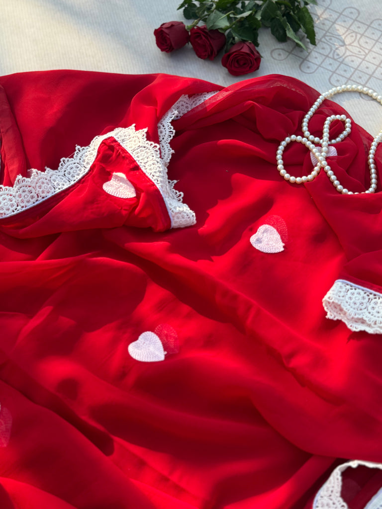 Make every moment memorable with the Heartly – Red with Hakoba Lace saree by Studio Virupa — a stunning semi-georgette creation perfect for festive celebrations, traditional functions, Valentine’s Day outfits, and special occasions.