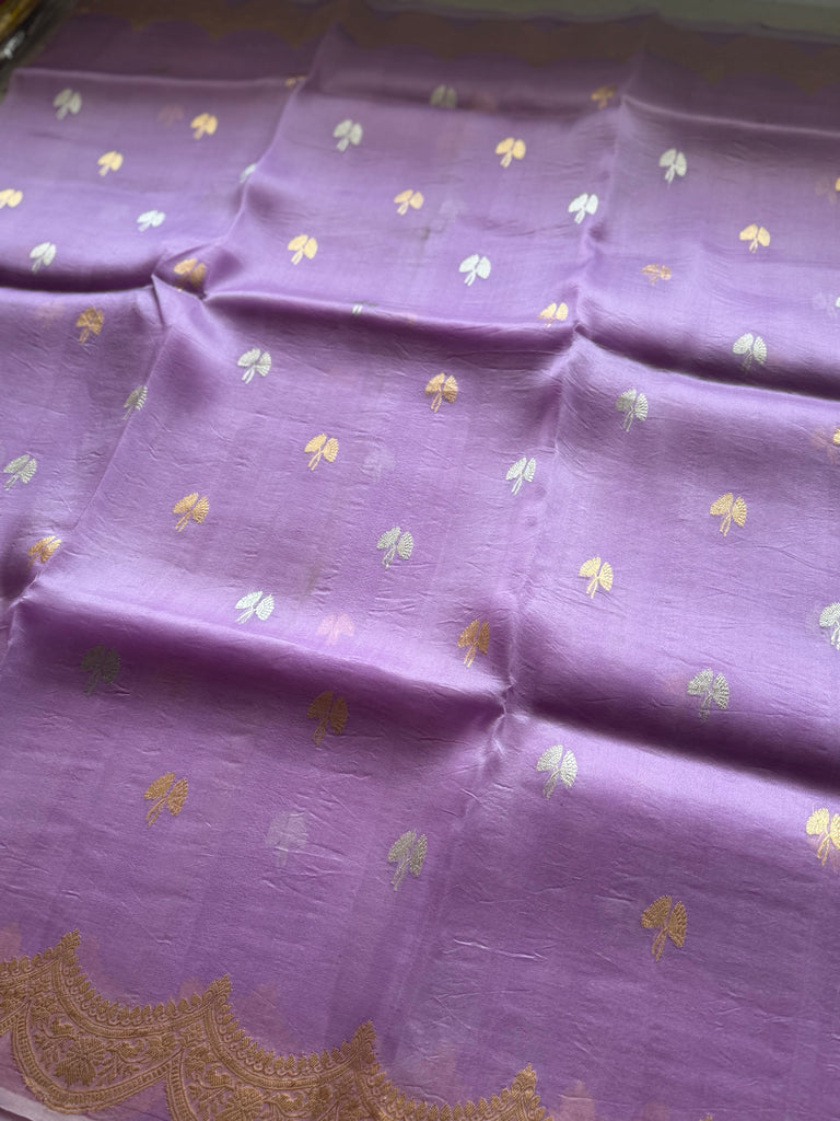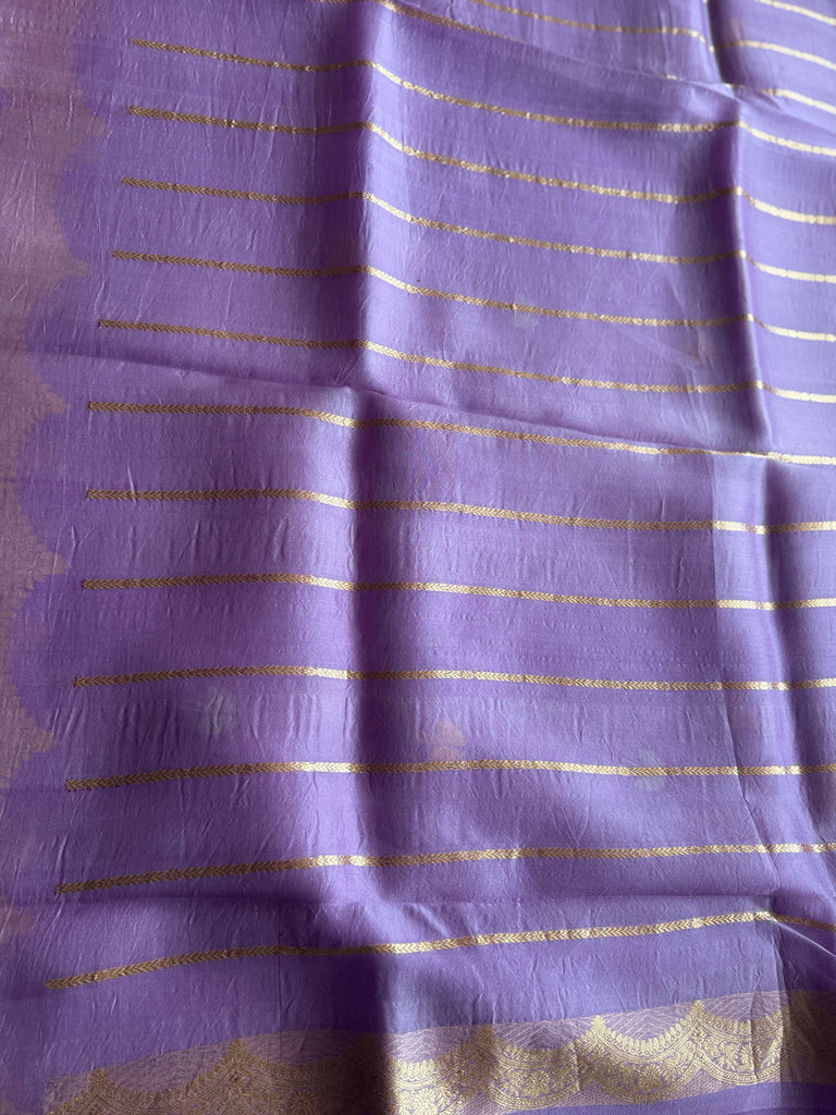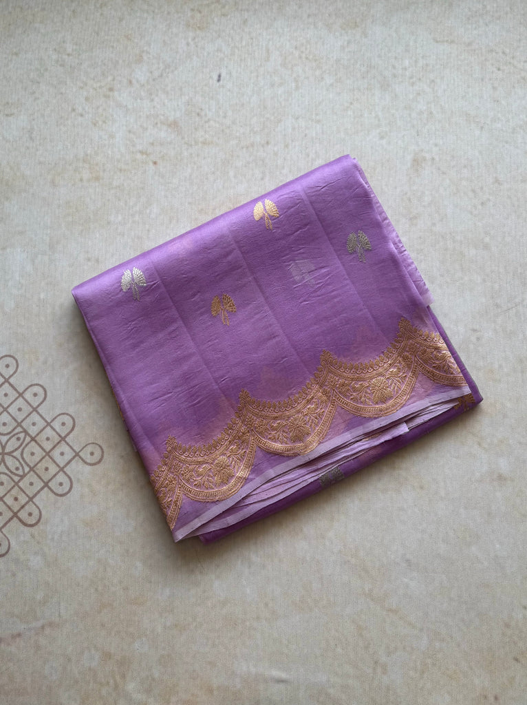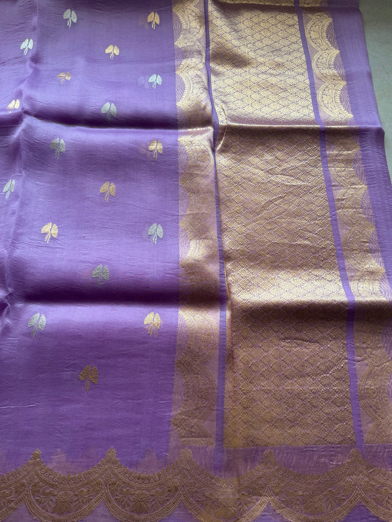 Step into soft sophistication with this wisteria purple hue pure organza saree, gracefully adorned with butterfly buttas in sona rupa zari that shimmer delicately across the dreamy lavender-toned fabric. The saree features a gold zari border that adds a regal edge to its lightweight, airy drape, offering comfort without compromising on elegance.