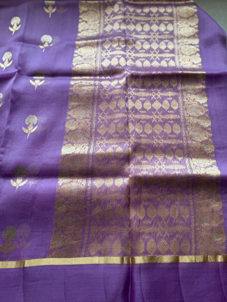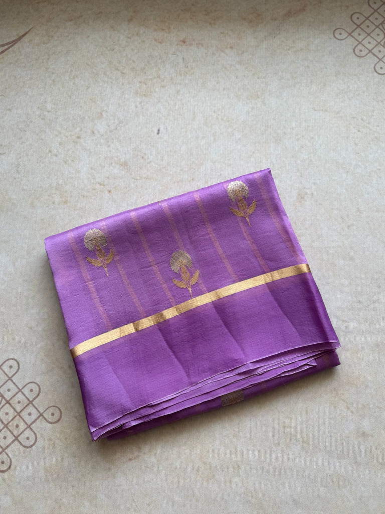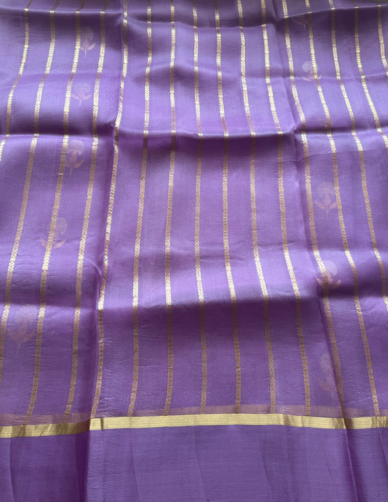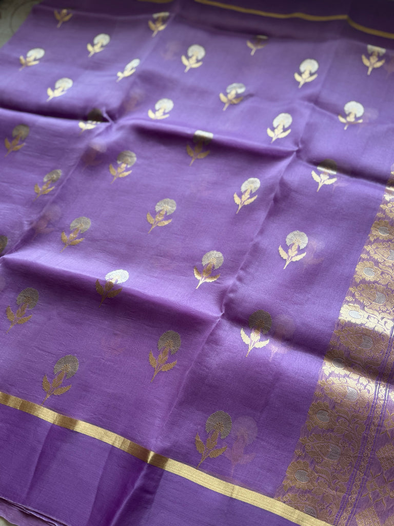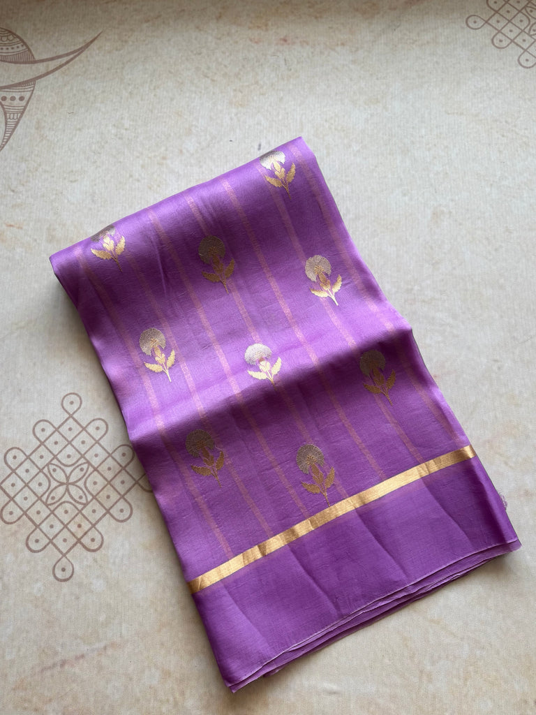 This Wisteria Purple Pure Organza Saree exudes understated elegance with its delicate sona rupa flower motifs scattered across the body. The soft, sheer fabric in a serene wisteria purple hue drapes gracefully, while the plain borderis enhanced with subtle gold lines, adding a touch of refinement.