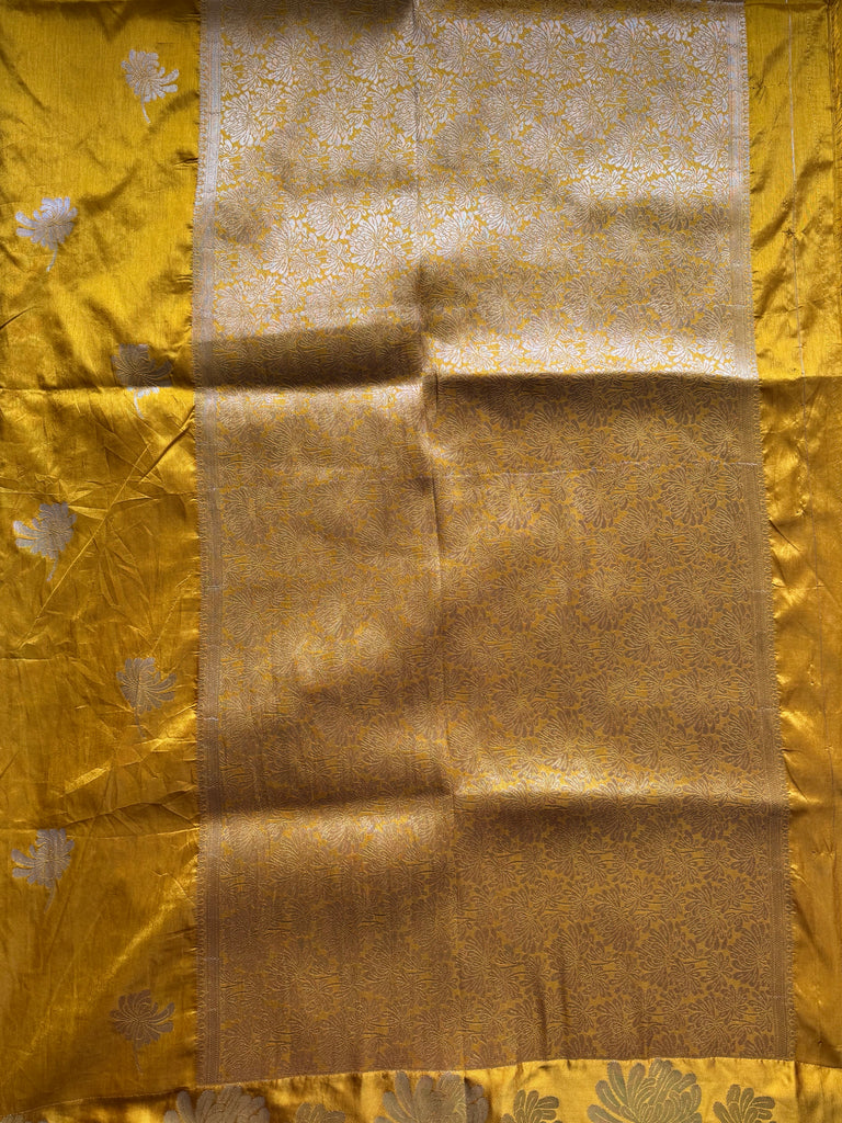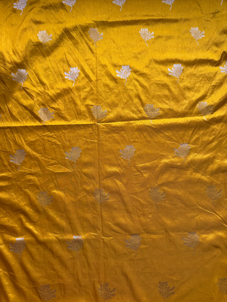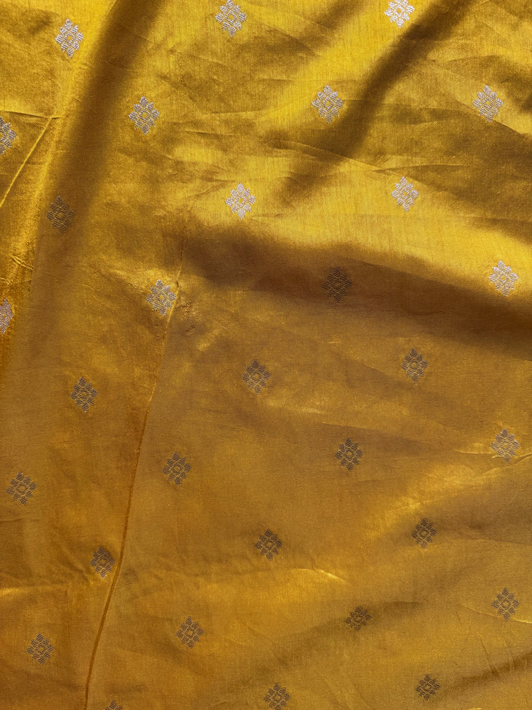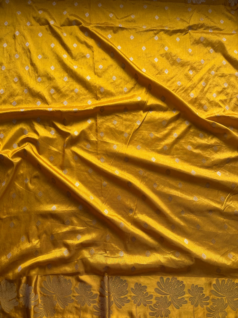Elevate your ethnic wardrobe with this exquisite amber-colored Matka Silk Banarasi saree. The saree features sona rupa zari buttas intricately woven across the body, creating a subtle yet sophisticated shimmer. Its broad gold zari border, adorned with delicate floral motifs, adds a timeless charm.