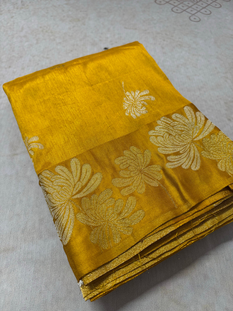 The highlight of the saree is its richly woven pallu, showcasing traditional zari craftsmanship that reflects regal elegance. Paired with a matching amber blouse, embellished with gold zari buttas, this ensemble offers a graceful and royal finish—perfect for festive occasions, weddings, or cultural celebrations.