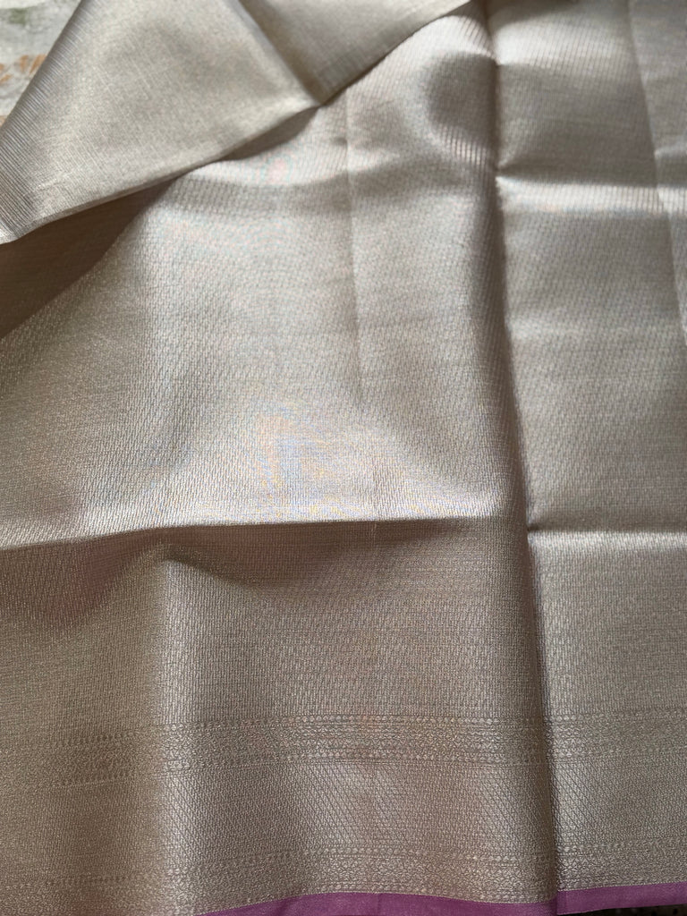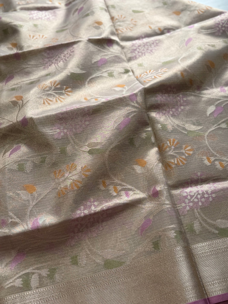 Radiating richness and tradition, this Banarasi Zari Kota Tissue saree comes in a shimmering golden hue, beautifully adorned with a vibrant meenakari jaal pattern. The intricate weave showcases fine craftsmanship, giving the saree a heavily embellished yet graceful look. The border and pallu shimmer with solid zari detailing, adding depth and a regal touch to the overall design. A touch of contrast is introduced with a blush pink selvedge, offering a delicate balance to the bold golden base.