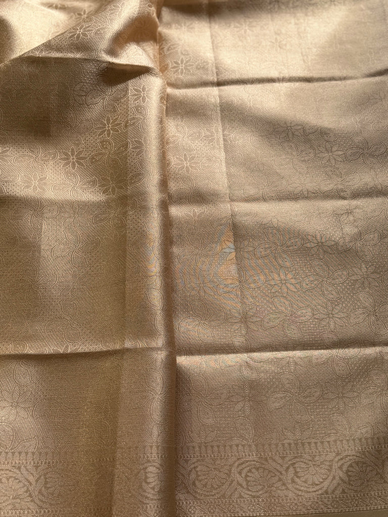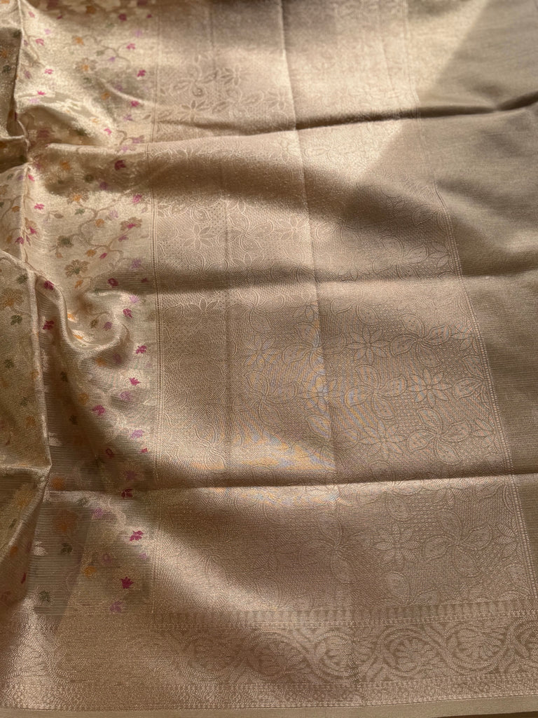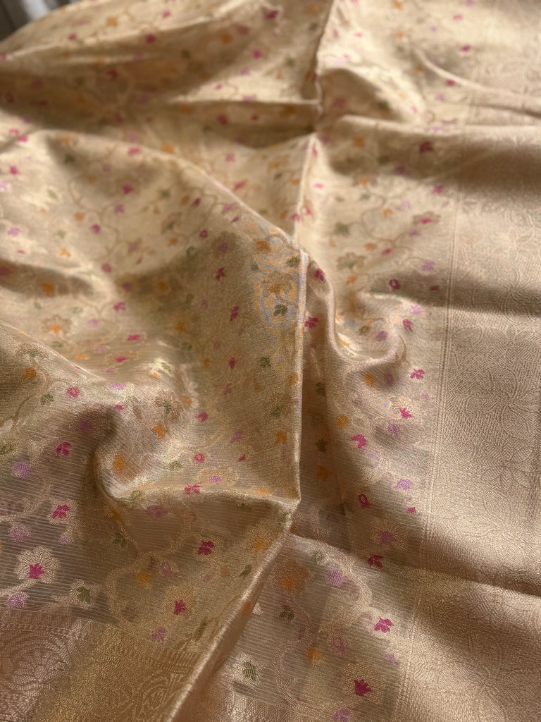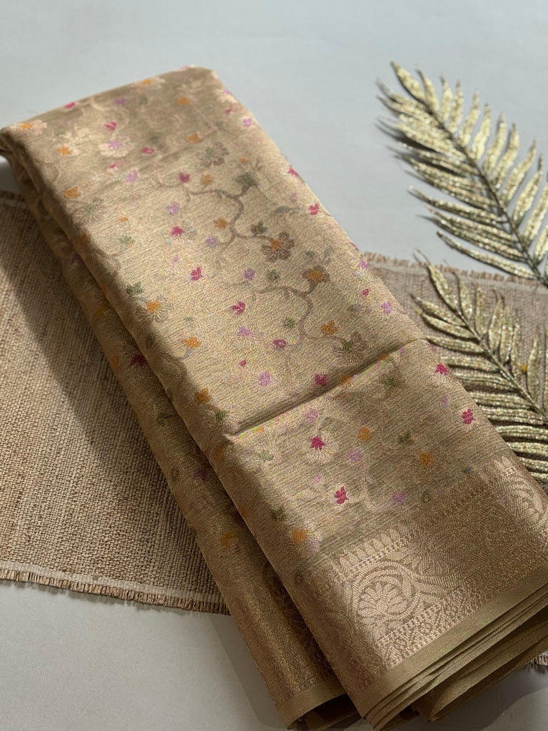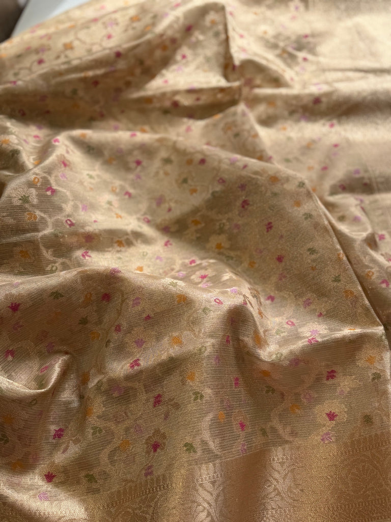 This Banarasi Zari Kota Tissue saree shimmers with a soft golden glow, blending tradition with contemporary elegance. The body showcases intricate zari jaal patterns, highlighted by vibrant meenakari accents that add a refined touch of color to the delicate weave.