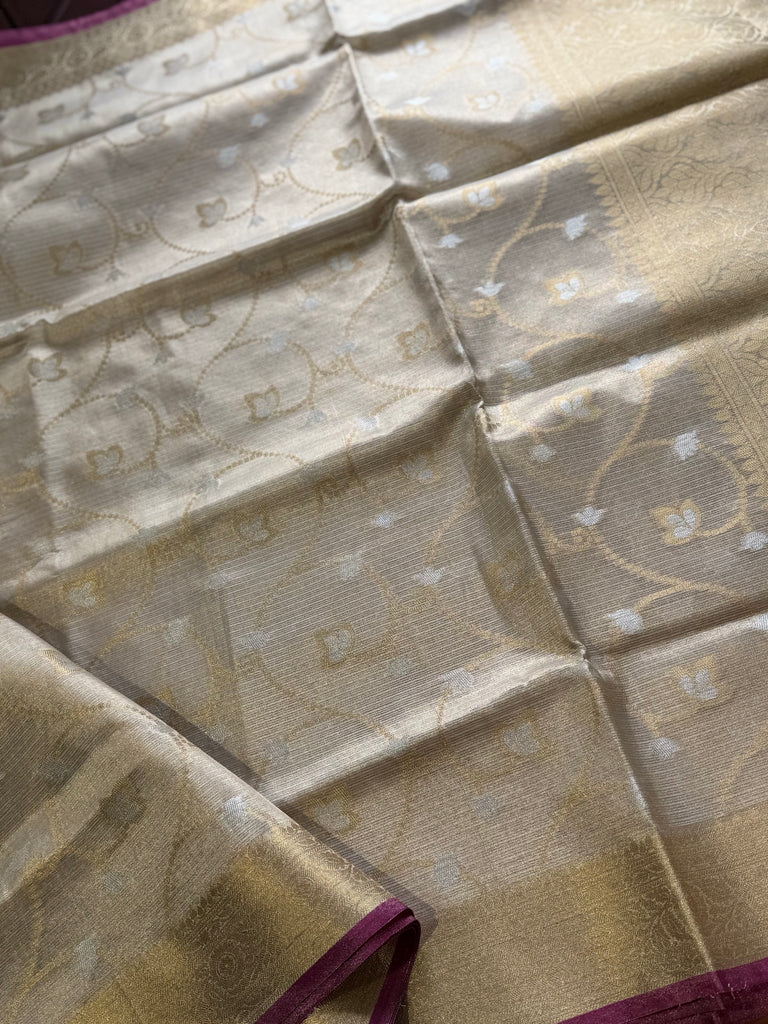 Tags: Tissue Saree, Gold Tissue Saree, Banarasi Tissue Saree, Zari Kota Saree, Banarasi Zari Kota Saree, Banarasi Meenakari Saree, Jaal Pattern Saree, Banarasi Saree, Festival Collections, Wedding Saree, Traditional Saree, Boutique Collections, Exclusive Saree.