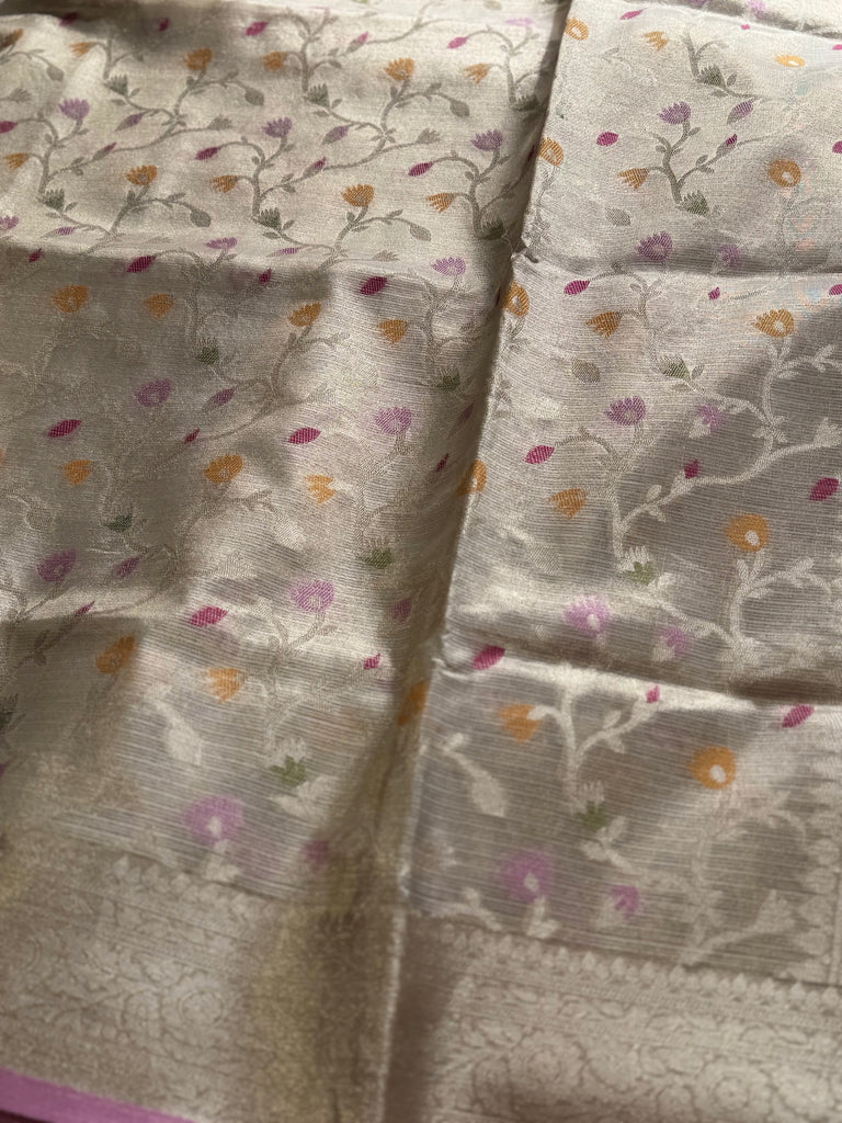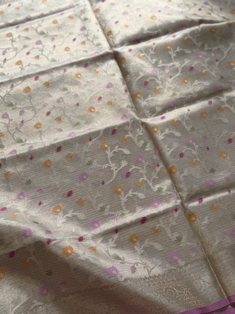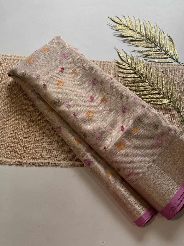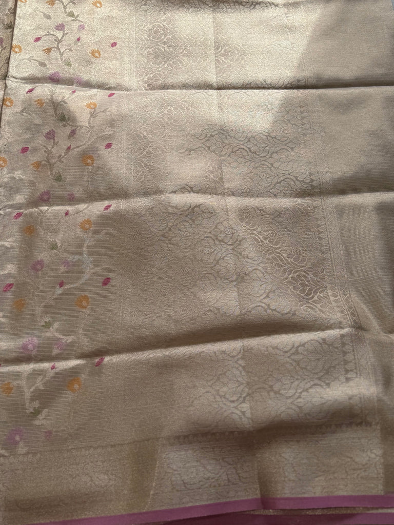This Banarasi Zari Kota Tissue saree shimmers with a soft golden glow, exuding timeless elegance. The body features intricate zari jaal patterns, beautifully accented with vibrant meenakari details that add a subtle pop of color to the delicate weave.