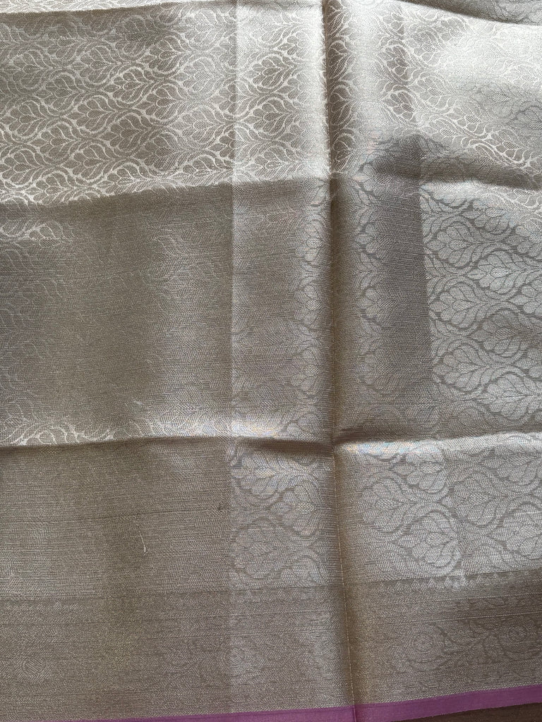 The border is adorned with refined zari designs, while a contrasting blush pink selvedge adds a contemporary touch. Completing the look, the pallu and blouse feature subtle, solid zari work, creating a balanced ensemble that is both graceful and effortlessly stylish — perfect for modern festive dressing.