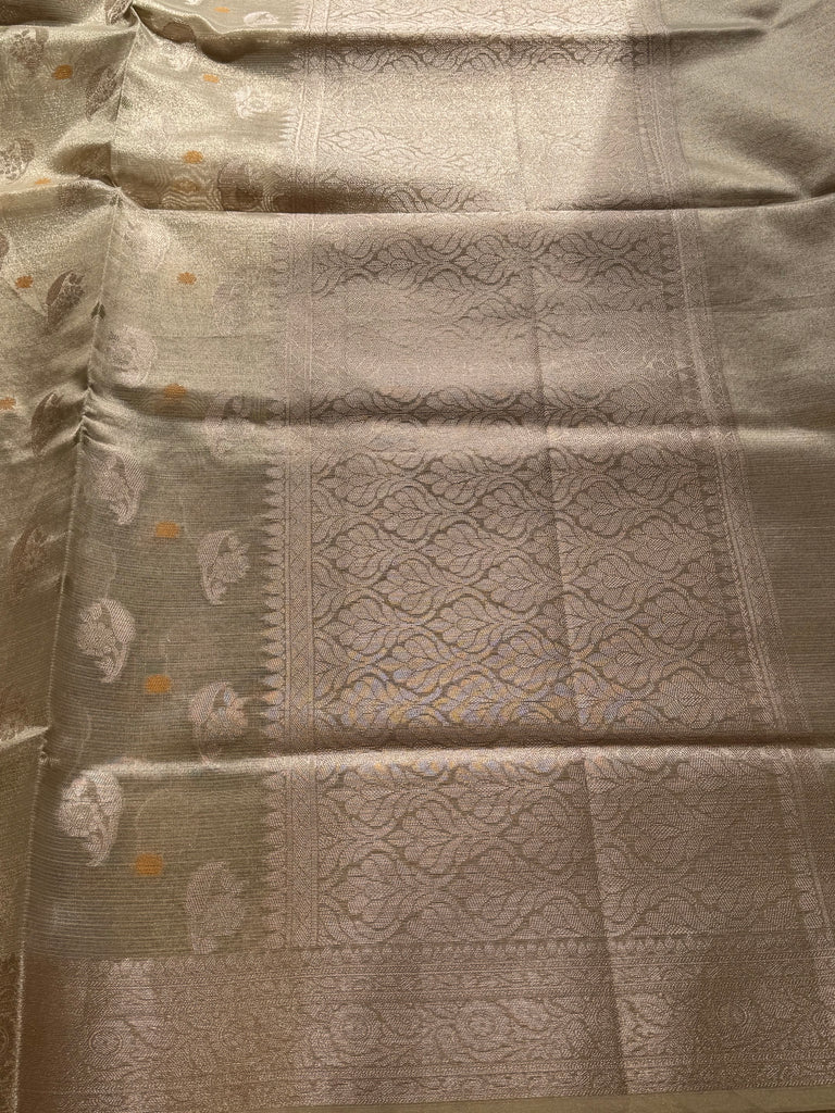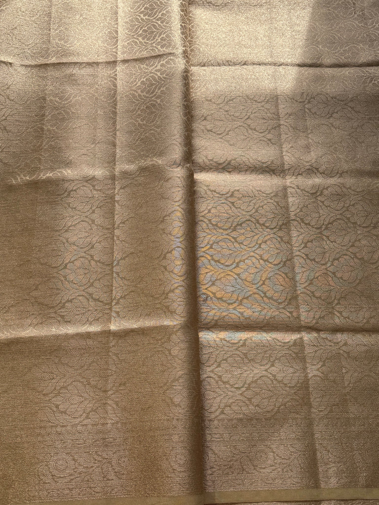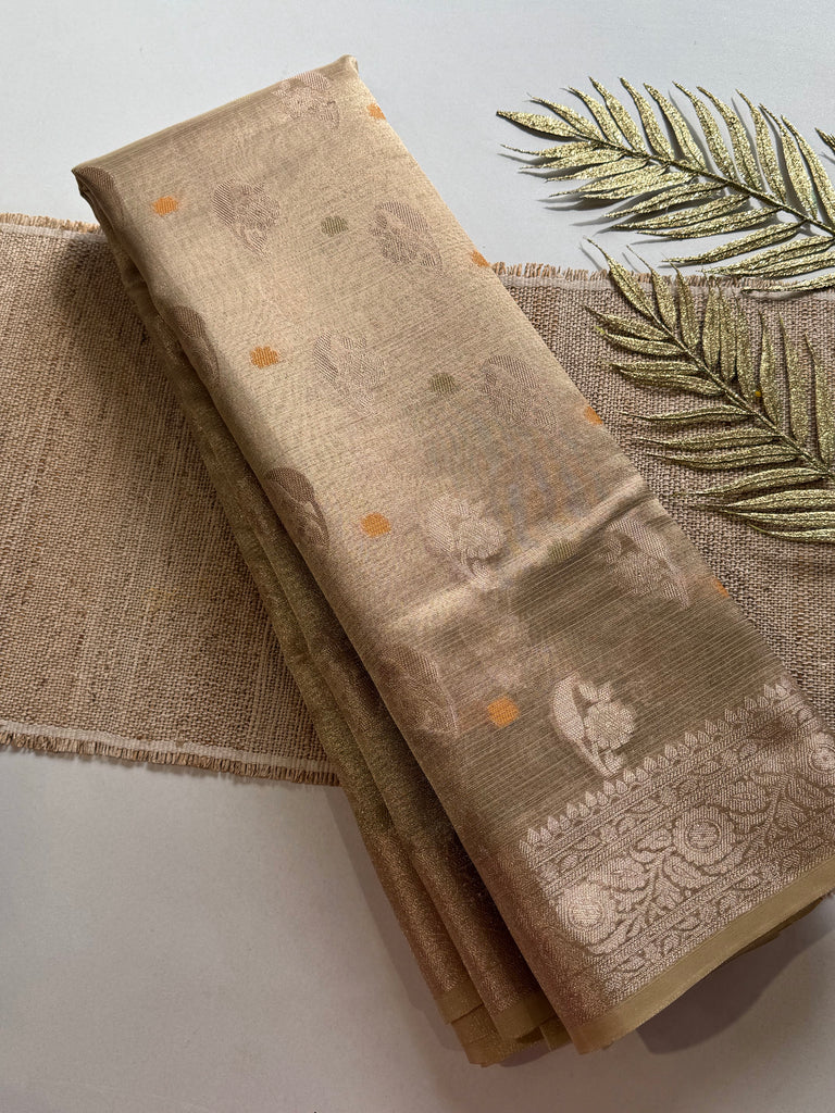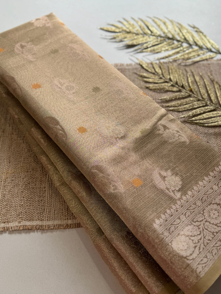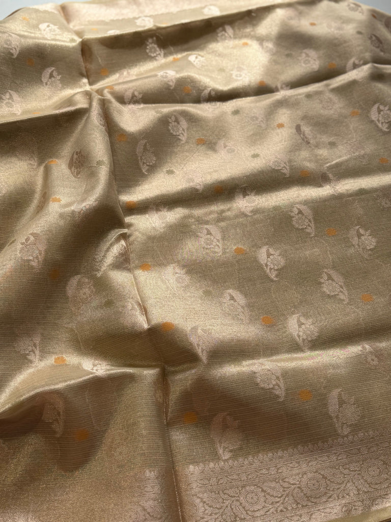 This Banarasi Zari Kota Tissue saree shimmers with a soft golden glow, exuding timeless elegance. The body features intricate zari jaal patterns, beautifully accented with meenakari details that add a subtle pop of color to the delicate weave.