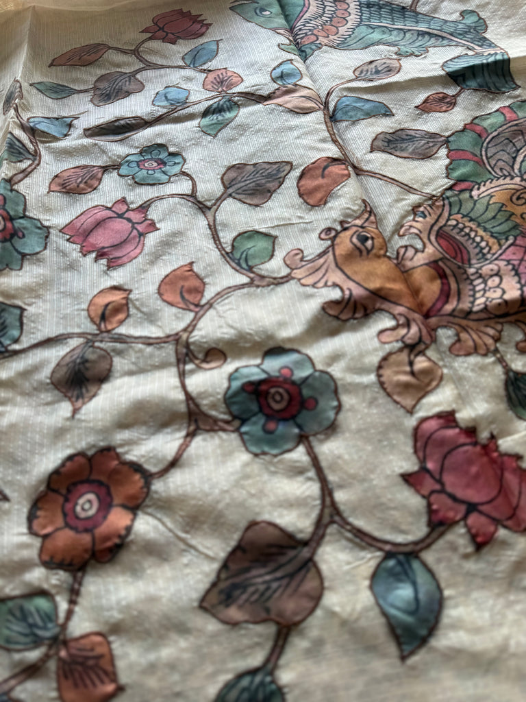 Make a statement of timeless elegance with this exquisite Ivory Tussar silk saree, adorned with intricate Kalamkari appliqué work. Crafted from rich, textured Tussar silk, the saree showcases a graceful play of traditional motifs and artisanal detailing. The hand-applied Kalamkari patches add depth and character, celebrating India’s age-old storytelling craft with a contemporary appeal.