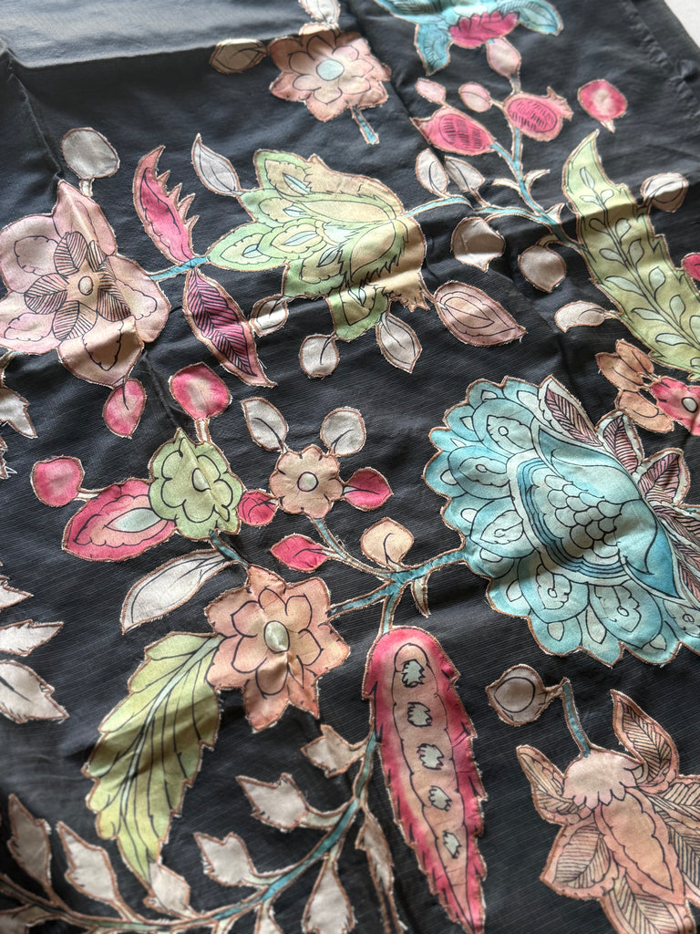 Make a statement of timeless elegance with this exquisite black Tussar silk saree, adorned with intricate Kalamkari appliqué work. Crafted from rich, textured Tussar silk, the saree showcases a graceful play of traditional motifs and artisanal detailing. The hand-applied Kalamkari patches add depth and character, celebrating India’s age-old storytelling craft with a contemporary appeal.