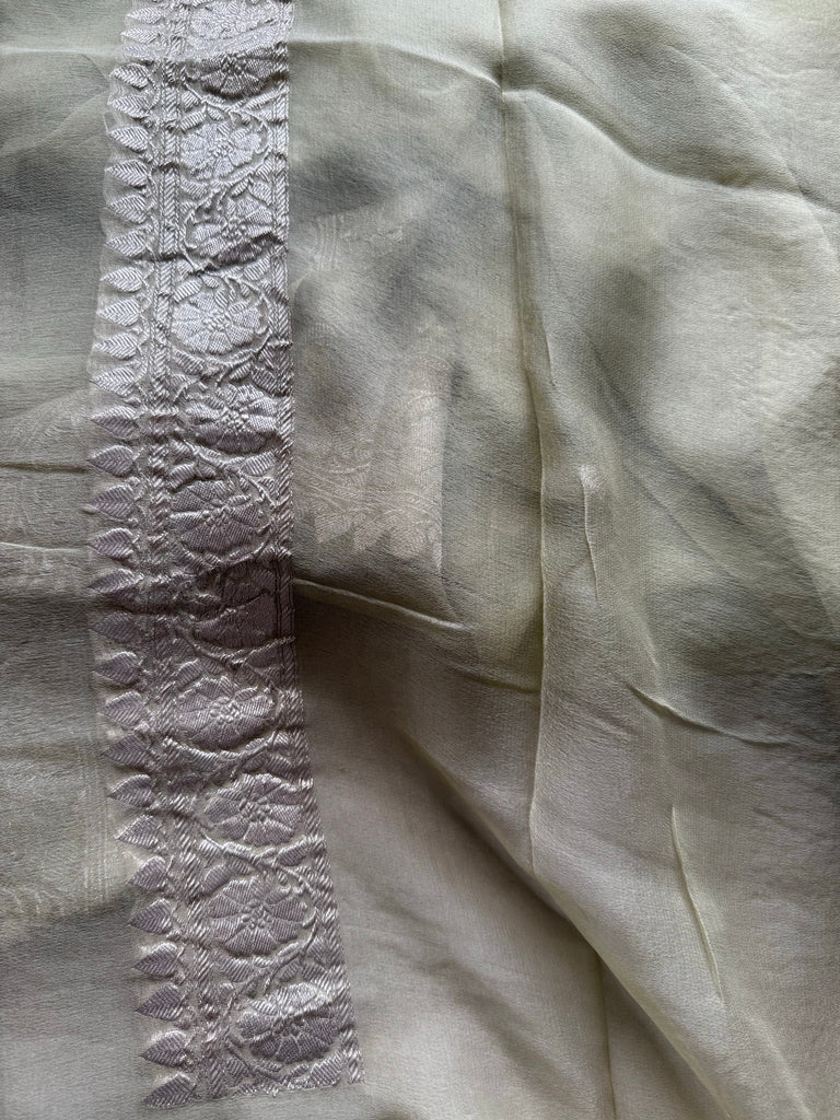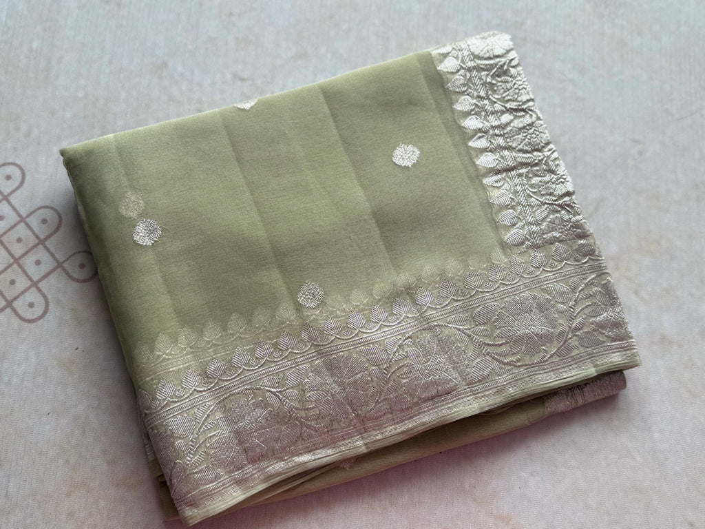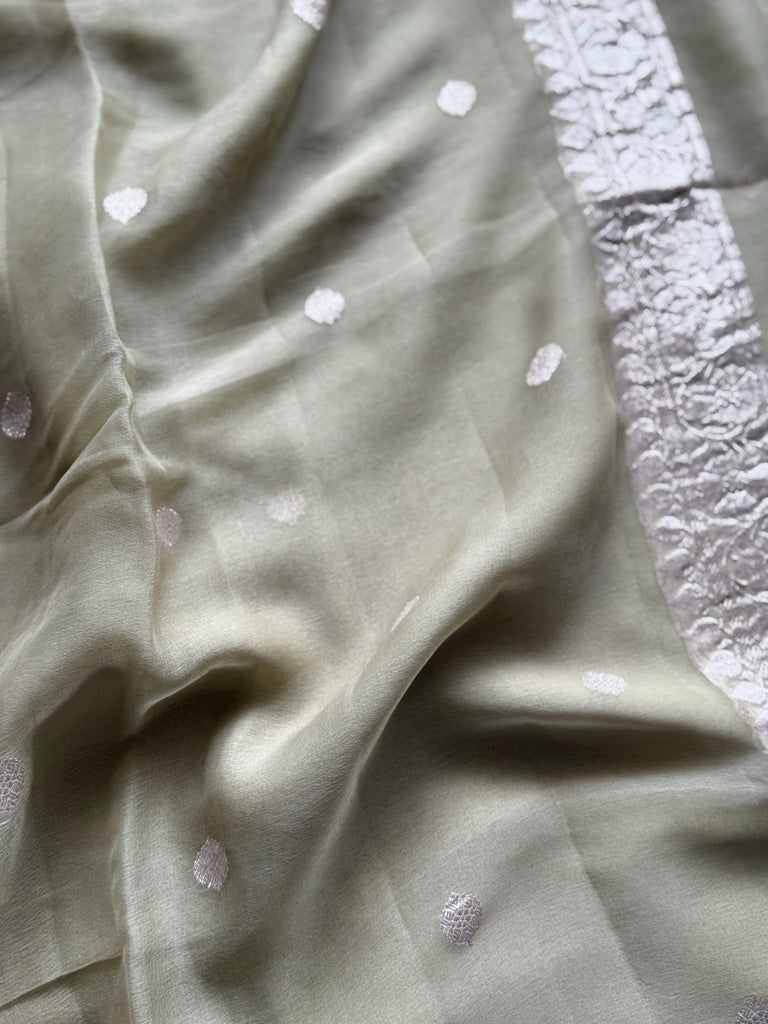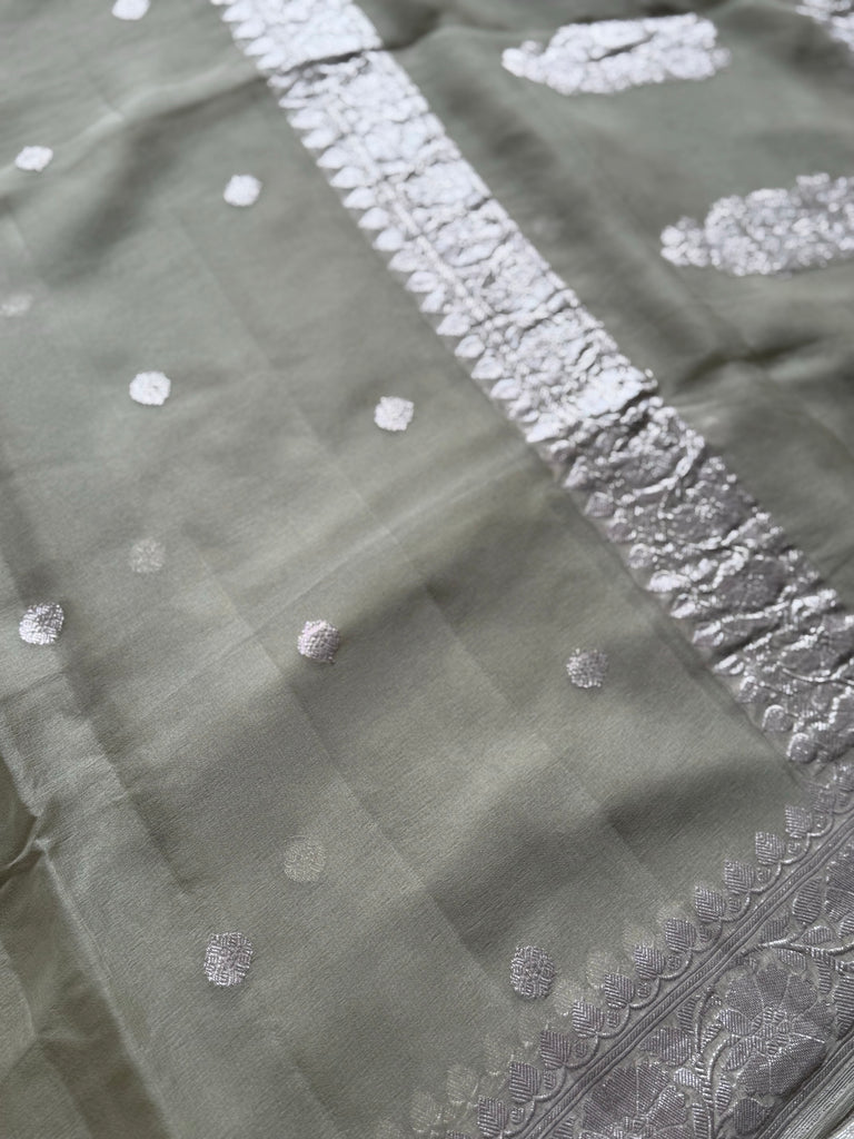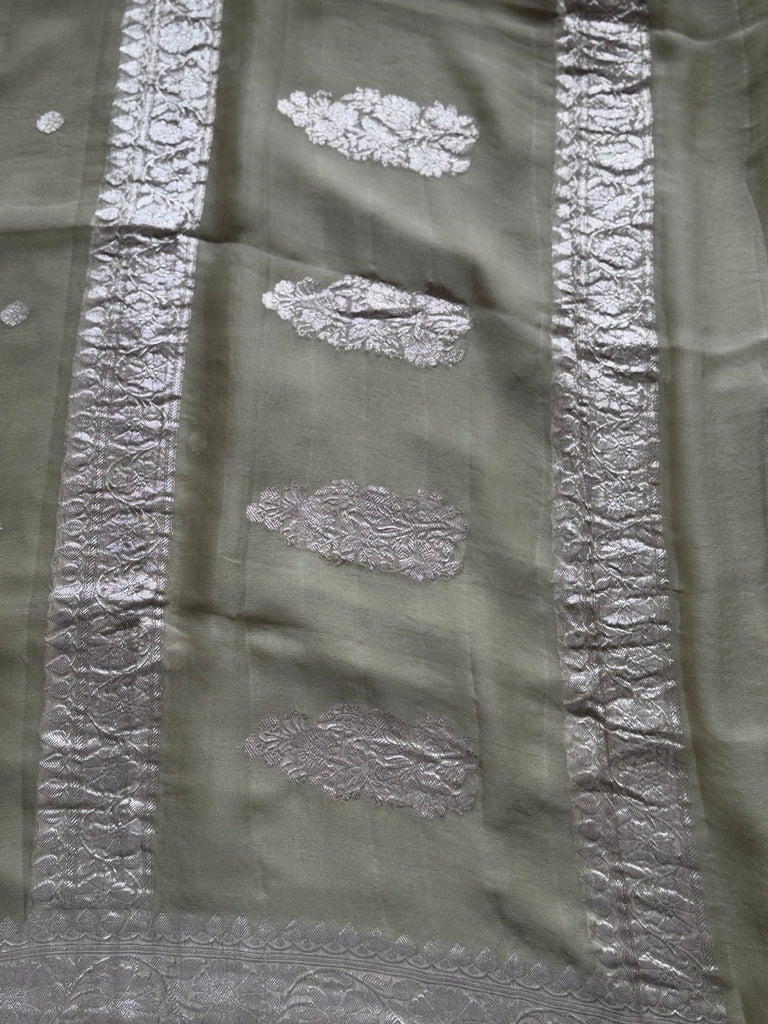 Make a graceful statement with this Pure Khaddi Chiffon Banarasi Saree, beautifully handwoven in a timeless pale olive shade.