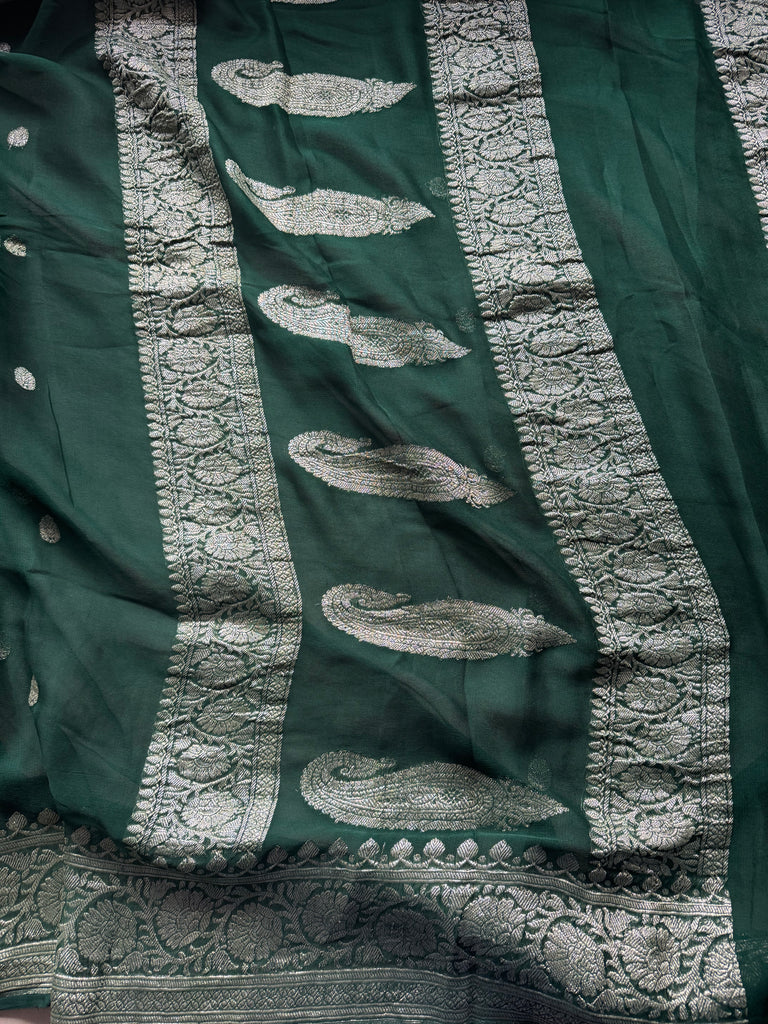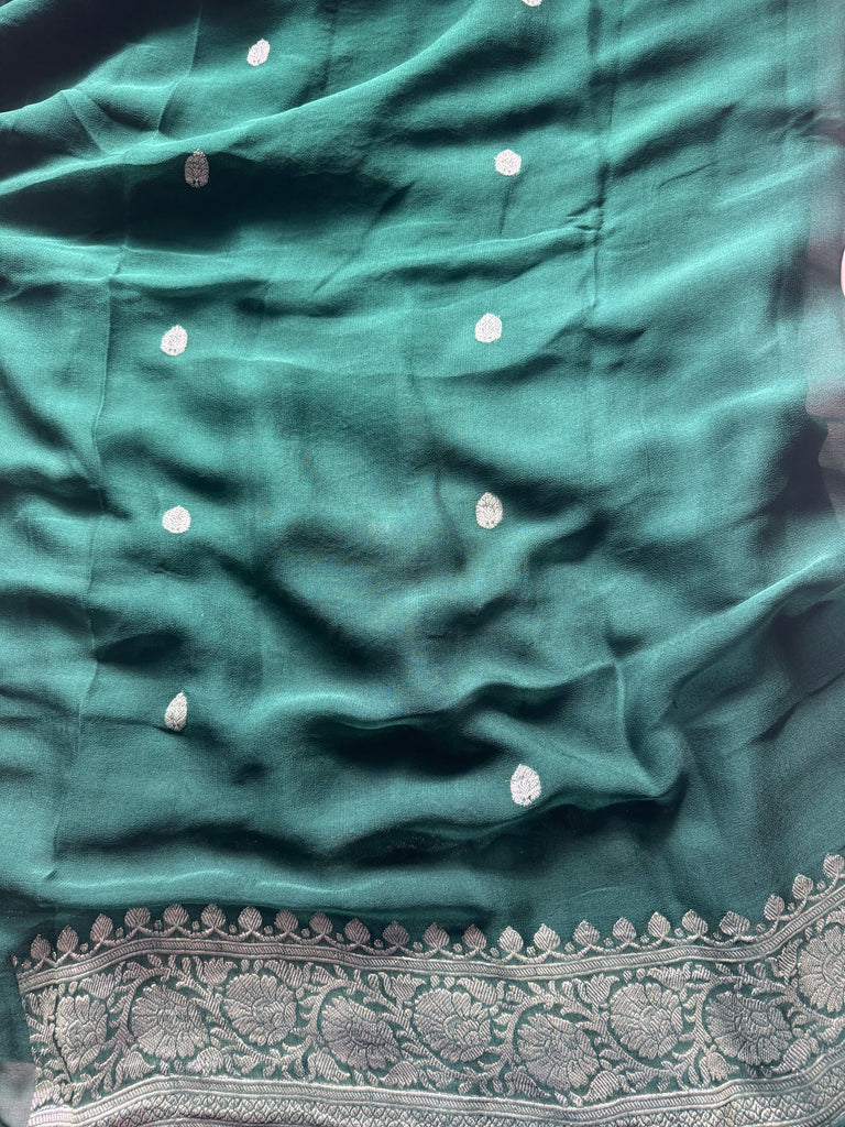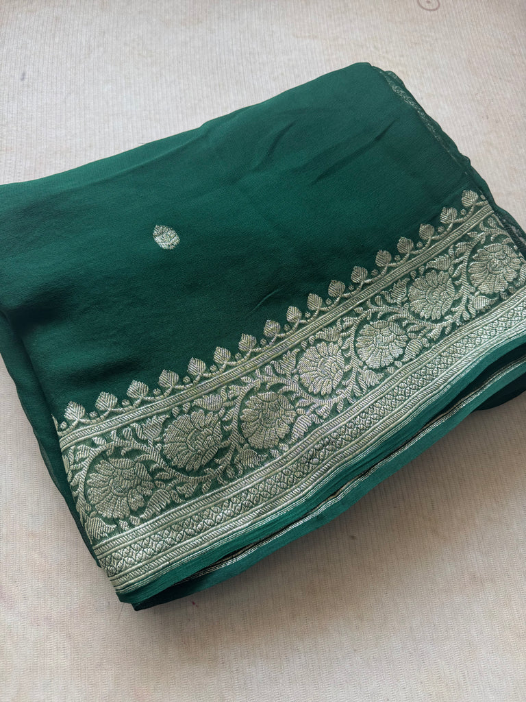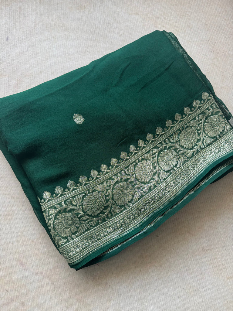 Make a graceful statement with this Pure Khaddi georgette Banarasi Saree, beautifully handwoven in a timeless green shade.