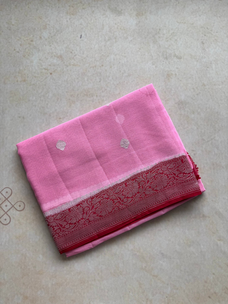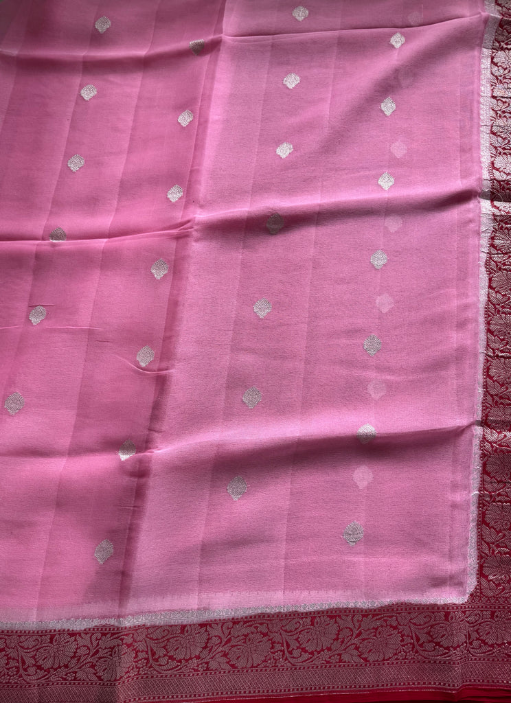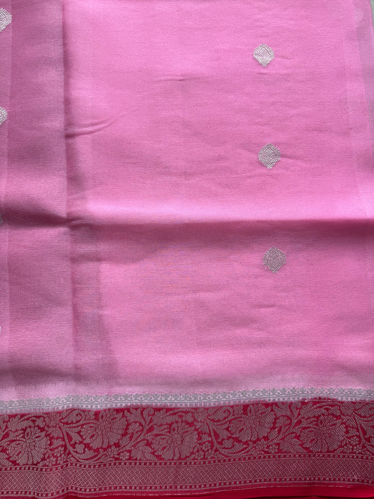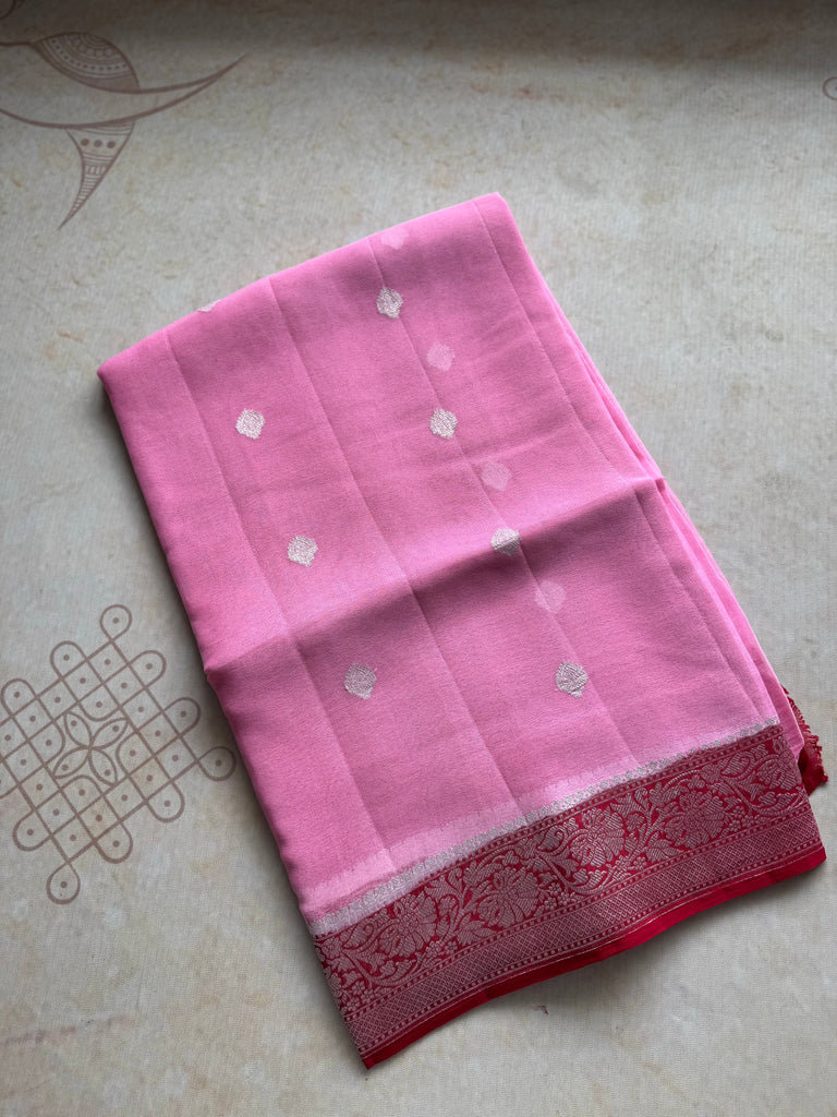 Elevate your ethnic wardrobe with this exquisite Pure Khaddi Chiffon Banarasi Saree in a rich Rose Milk Pink shade. Known for its feather-light drape and luxurious feel, this saree is adorned with shimmering silver zari buttas delicately woven across the body, offering a perfect blend of tradition and elegance.