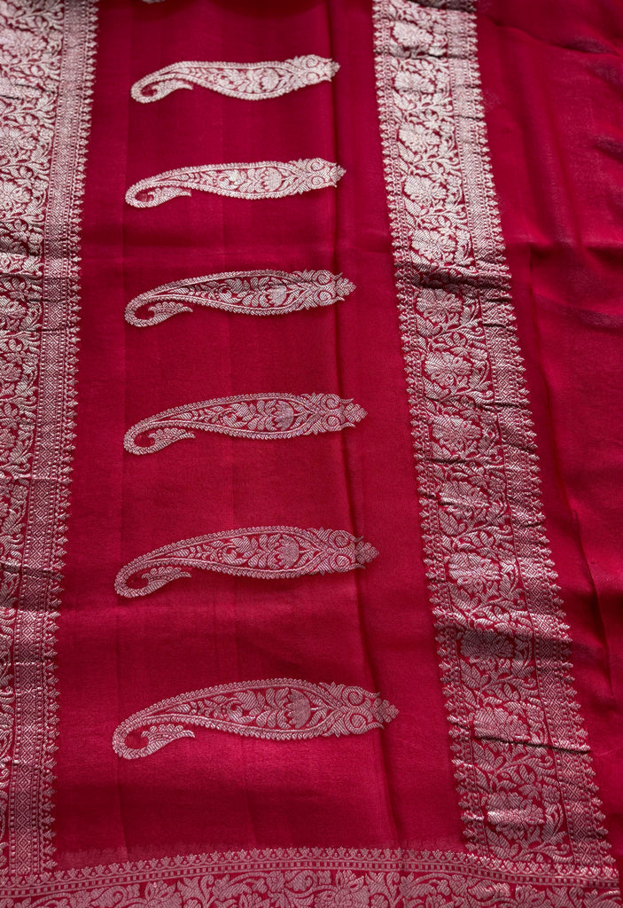 The beautiful Rich Red colour crafted with silver zari border adds a regal touch, highlighting the saree's timeless charm. The Red pallu is gracefully embellished with elegant motifs, showcasing the finesse of traditional Banarasi weaving.