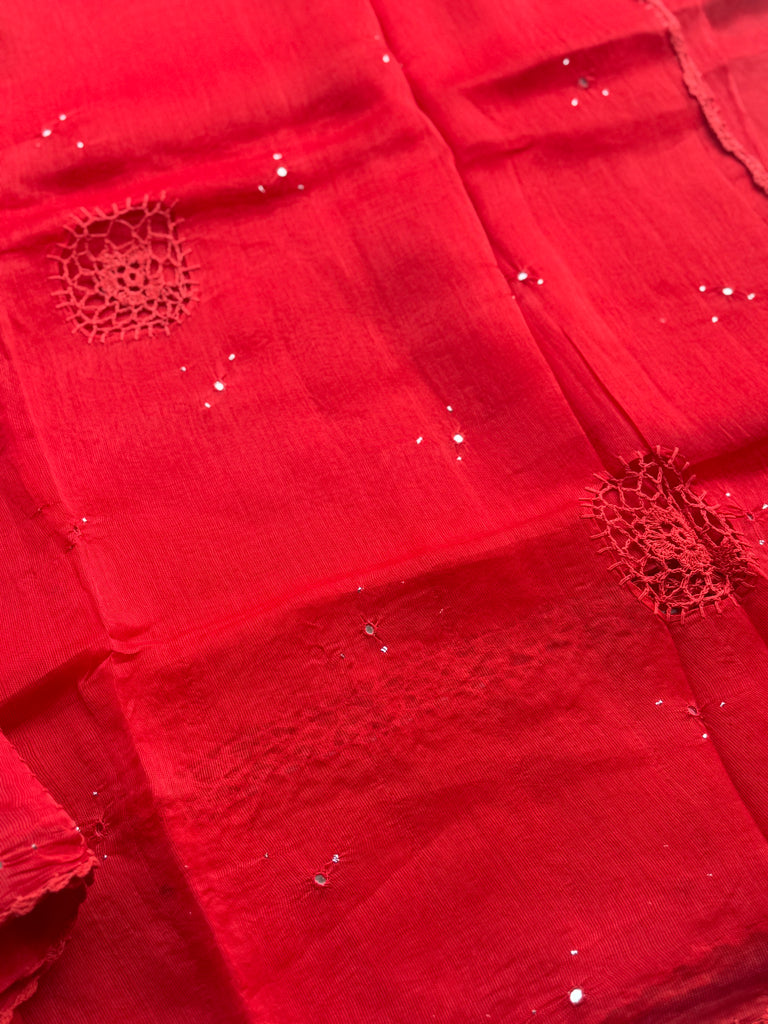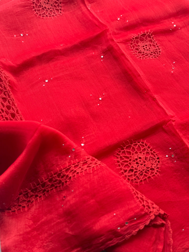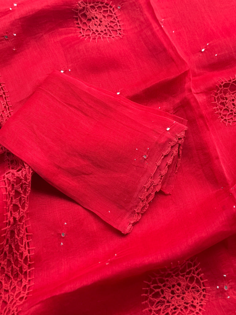 Delicate craftsmanship meets timeless elegance in this Red Kota cotton crochet saree. Crafted from lightweight, breathable Kota cotton, the saree features intricate crochet cutwork that adds texture and artisanal charm. A beautifully finished scalloped lace border enhances its graceful drape, while subtle mirror detailing lends a soft shimmer, catching the light with every movement.