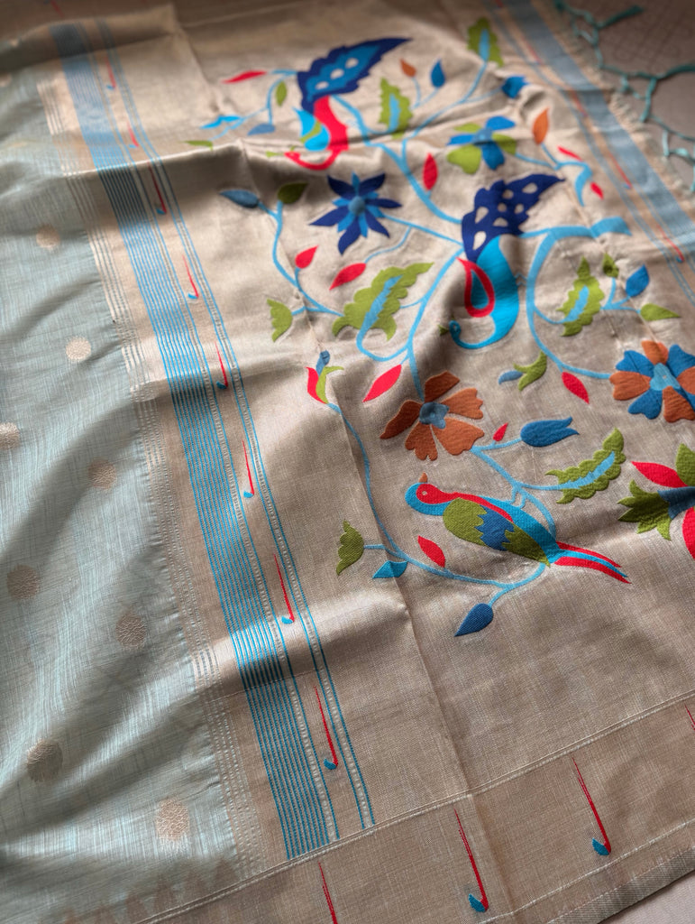 This elegant linen Paithani saree is a perfect blend of tradition and modern sophistication. The saree features subtle zari buttas scattered across the body, creating a graceful shimmer without overpowering its natural charm. A beautifully woven border with intricate motifs adds a touch of refined artistry and timeless appeal.