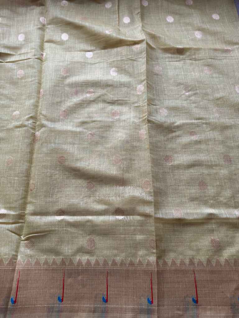 This elegant linen Paithani saree is a perfect blend of tradition and modern sophistication. The saree features subtle zari buttas scattered across the body, creating a graceful shimmer without overpowering its natural charm. A beautifully woven border with intricate motifs adds a touch of refined artistry and timeless appeal.