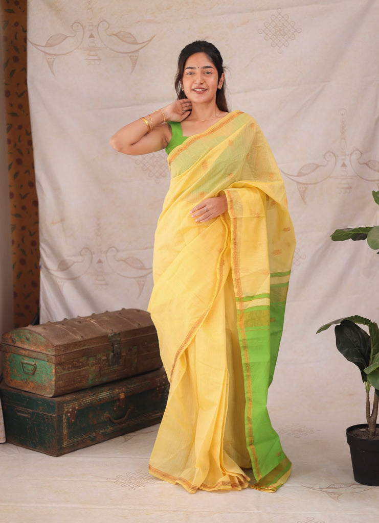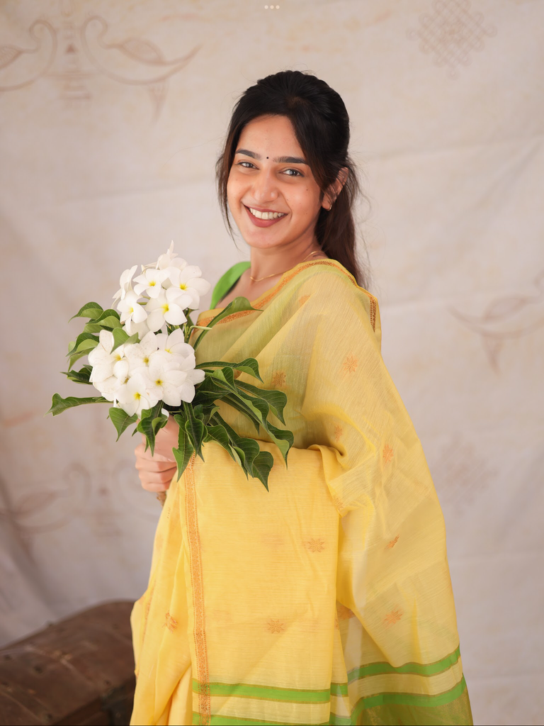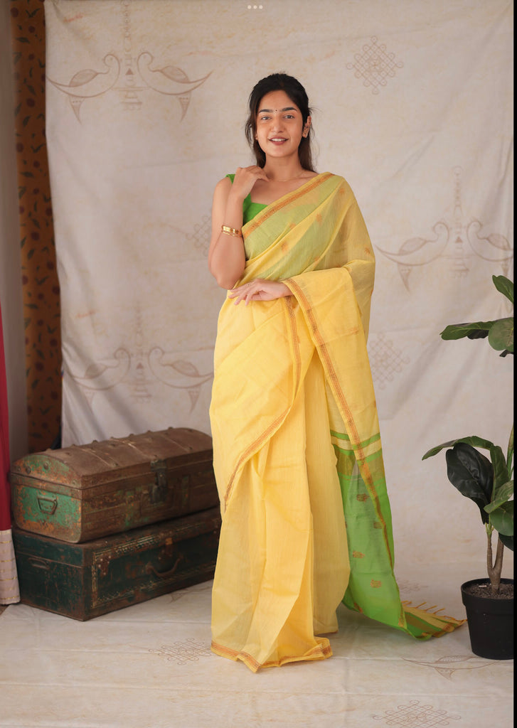Expertly crafted from a blend of silk and cotton, the Maheshwari Silk Cotton Saree boasts elegant golden buttas and a subtle zari border. The lightweight saree features a beautiful light yellow shade body with a contrasting light Green pallu. Perfect for any occasion, this saree offers both style and comfort.