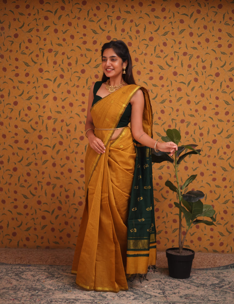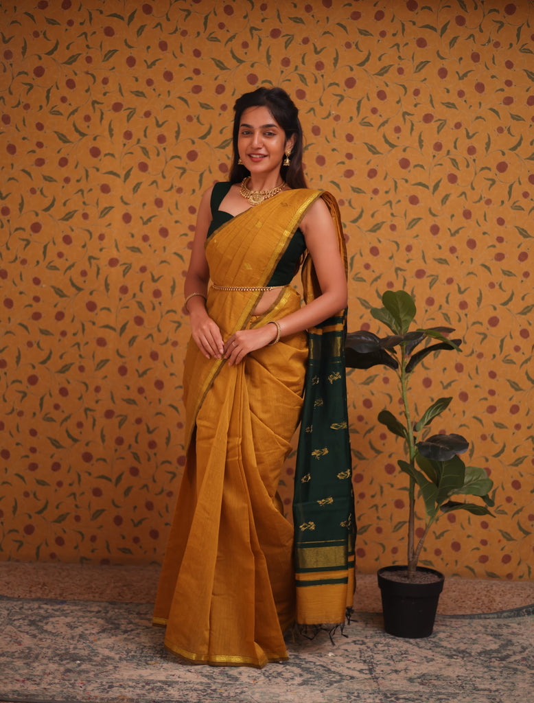 Expertly crafted from a blend of silk and cotton, the Maheshwari Silk Cotton Saree boasts elegant golden buttas and a subtle zari border. The lightweight saree features a beautiful Fenugreek yellow shade body with a contrasting Dark Green pallu. Perfect for any occasion, this saree offers both style and comfort.