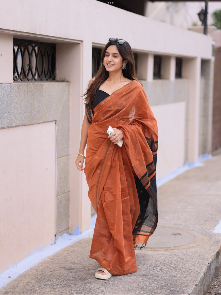 Elevate your style with the classic charm of the Maheshwari Silk Cotton Saree. Made from a luxurious cotton-silk blend, this saree features delicate copper buttas and a contrasting c color palette. Complete with a small zari border, this saree is a must-have for vintage lovers.