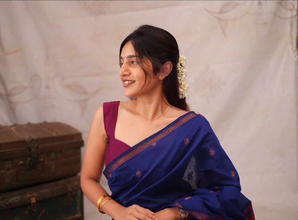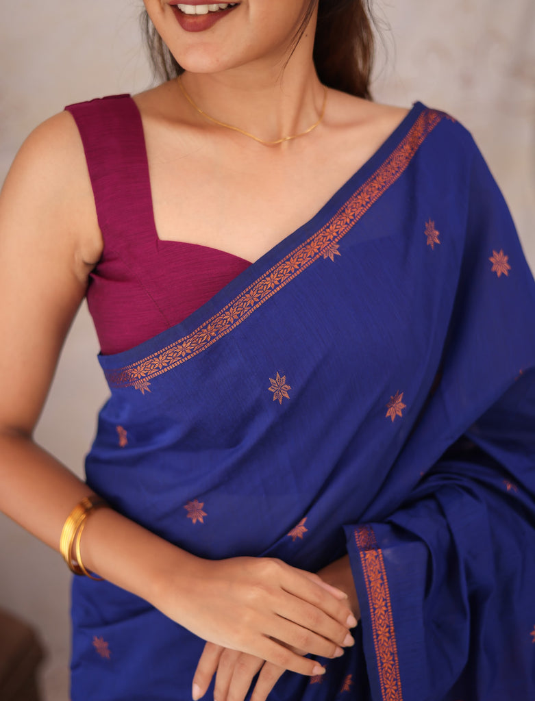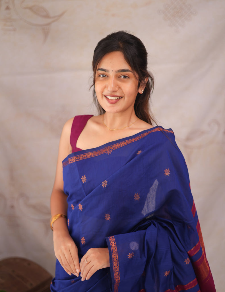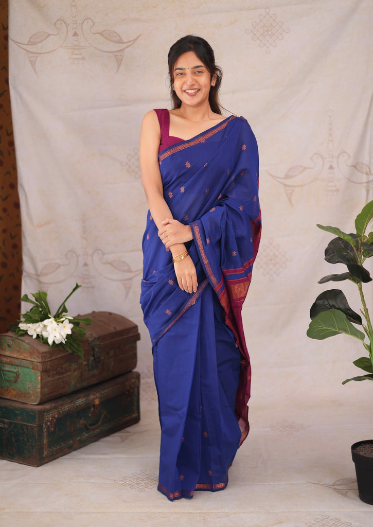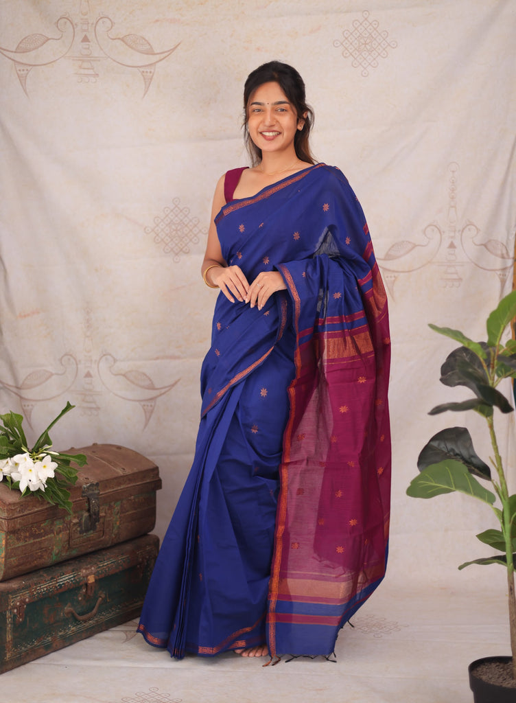 Expertly crafted from a blend of silk and cotton, the Maheshwari Silk Cotton Saree boasts elegant golden buttas and a subtle zari border. The lightweight saree features a beautiful Blue shade body with a contrasting Magenta pallu. Perfect for any occasion, this saree offers both style and comfort.
