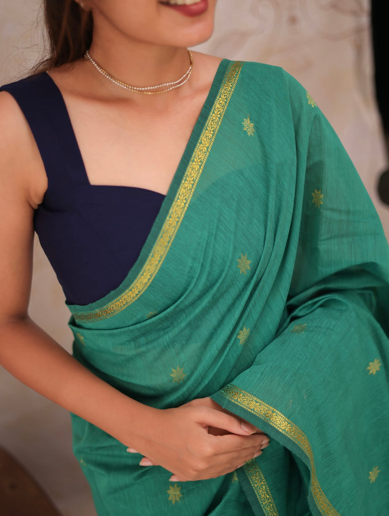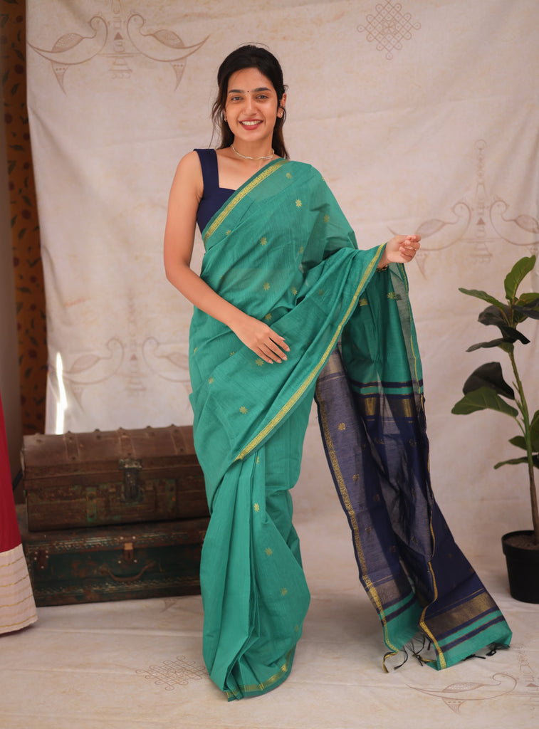 Expertly crafted from a blend of silk and cotton, the Maheshwari Silk Cotton Saree boasts elegant golden buttas and a subtle zari border. The lightweight saree features a beautiful Teal Green shade body with a contrasting Dark Navy pallu. Perfect for any occasion, this saree offers both style and comfort.