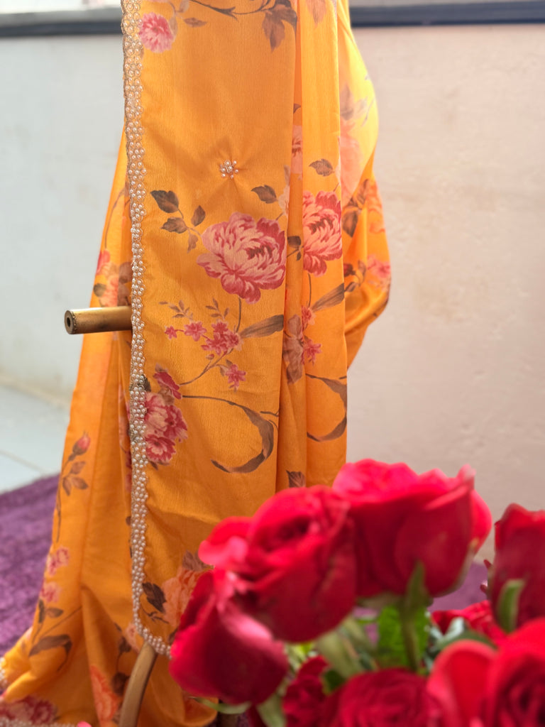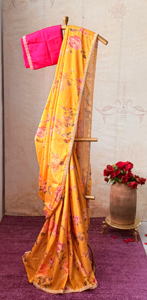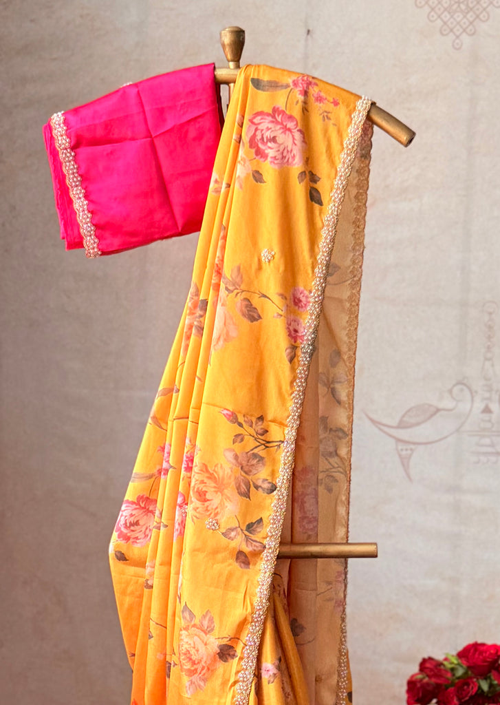 This exquisite boutique saree is crafted in luxurious Mango Yellow Malai grape silk, adorned with delicate floral prints that add a timeless charm. The rich texture of the fabric enhances its graceful drape, making it a perfect choice for special occasions.