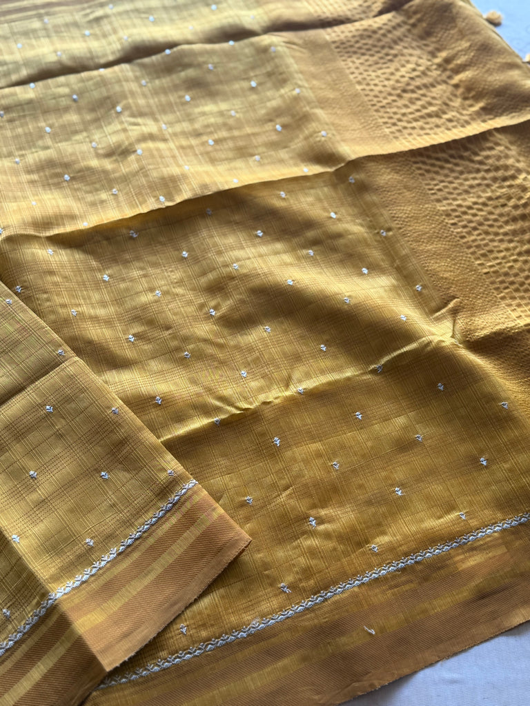 Rooted in natural luxury, this Mustard Jute Tussar Saree celebrates understated elegance and artisanal finesse. Woven in breathable jute tussar silk, the saree features subtle hand embellishments scattered gracefully across the body, adding just the right touch of shimmer without overpowering its organic charm.
