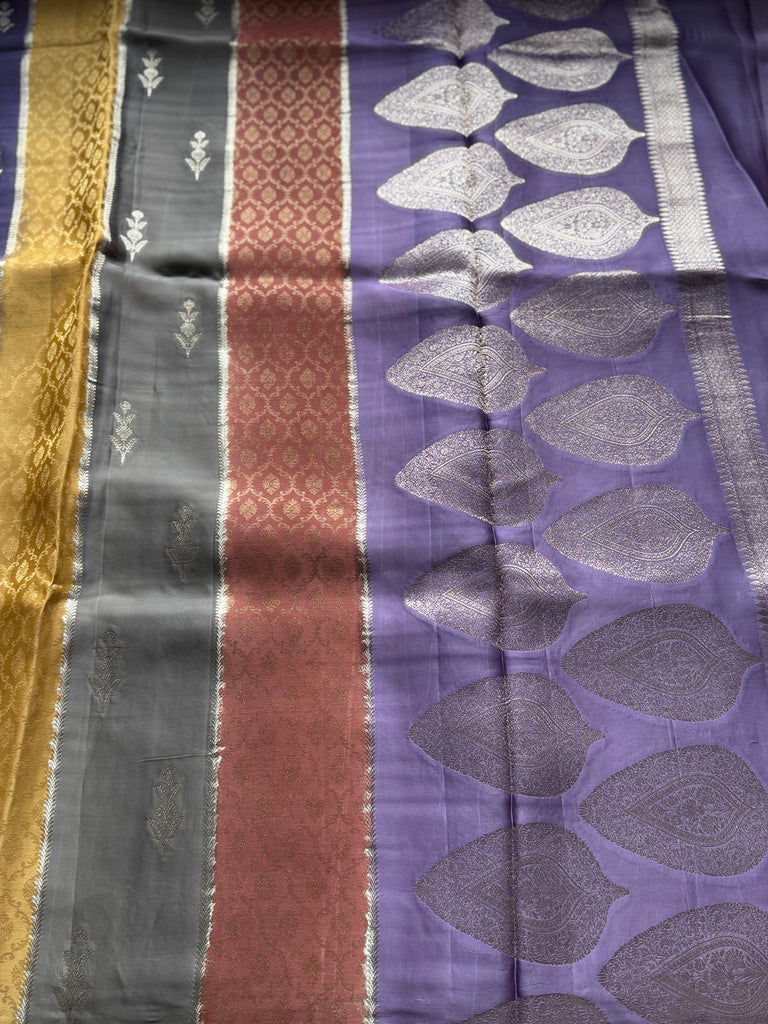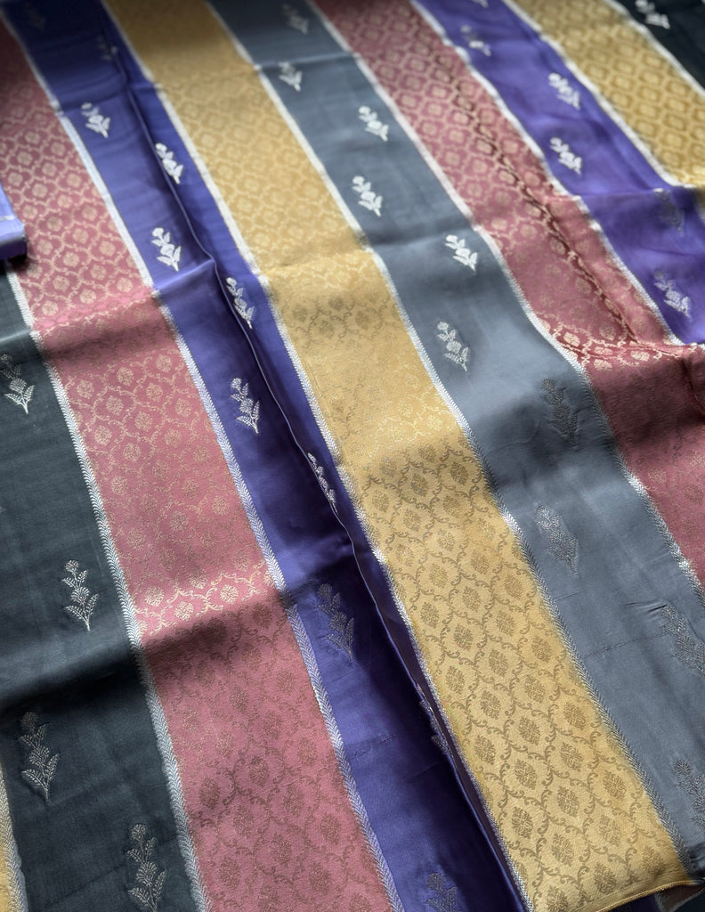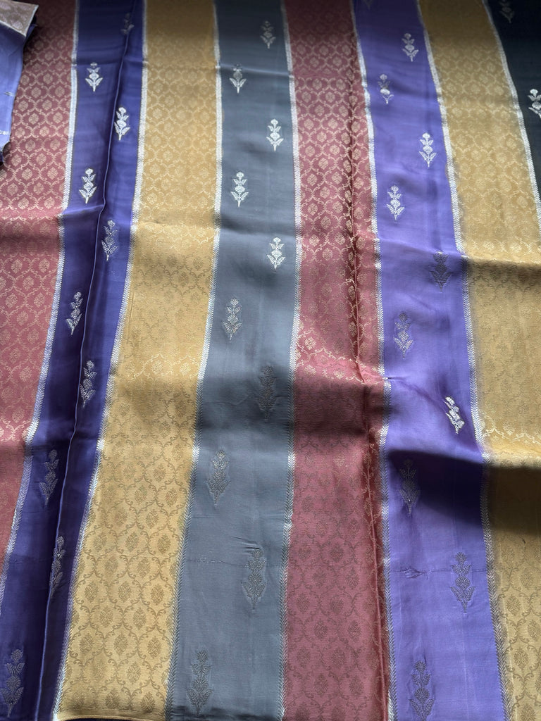 Celebrate the beauty of traditional weaving with this stunning Rangkat Pure Mashru Silk Saree. Made using the intricate and time-consuming Rangkat technique, each colorful stripe is handwoven with care, creating a vibrant pattern across the saree. The body is further enhanced with golden zari work, adding a subtle shimmer and rich texture. The pallu is detailed with gold zari leaf motifs, offering a graceful contrast and finishing touch.